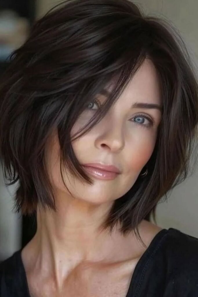 The wispy fringe bob is a timeless choice for women over 40. Soft, thin bangs blend into the bob, offering a youthful look without appearing heavy. Hair falls just above the shoulders, with slight layering for volume. Styling is simple, often just a quick blow-dry with a round brush to enhance movement.