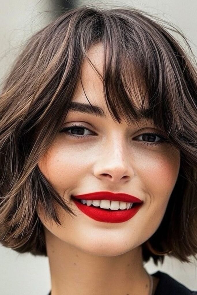 The soft fringe bob is ideal for women looking to frame their face subtly. This cut ends just below the jawline and includes delicate front bangs that blend with the rest of the hair. The fringe softens sharp facial lines and highlights the eyes. For added movement, layers are slightly feathered through the ends. Styling requires minimal effort—air drying or a quick round-brush blowout is enough to maintain a polished look.