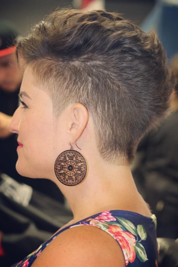 The tapered faux hawk offers a bold, contemporary option for women over 40. Hair is closely cut on the sides, gradually longer in the center. This cut works for fine or thick hair, creating height and dimension without needing heavy products.