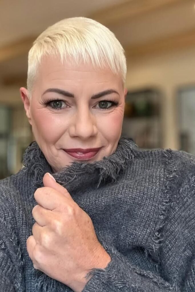 A blonde crop cut is bold, fresh, and modern. The short length highlights facial features, and adding a soft fringe can reduce forehead prominence. This style works beautifully with silver-blonde or warm blonde tones, creating brightness around the face and emphasizing youthful energy.