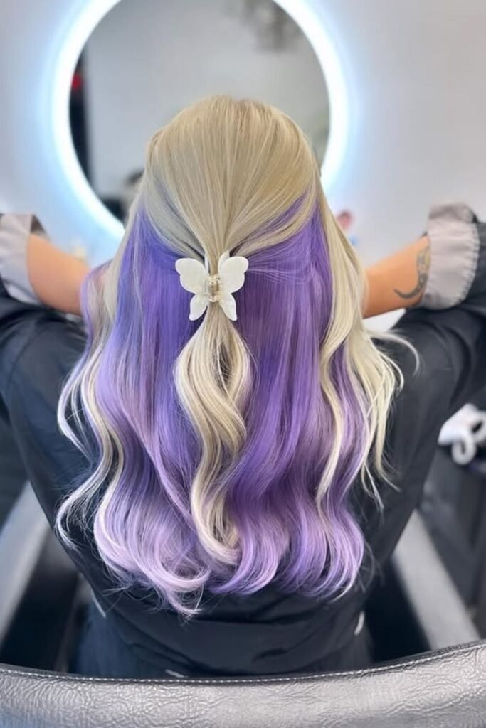 Lavender underlayer peekaboo uses soft purple tones placed under the crown or mid layers. It shows most when hair is curled or tied half-up.
