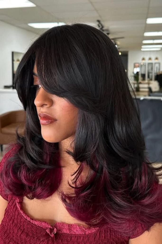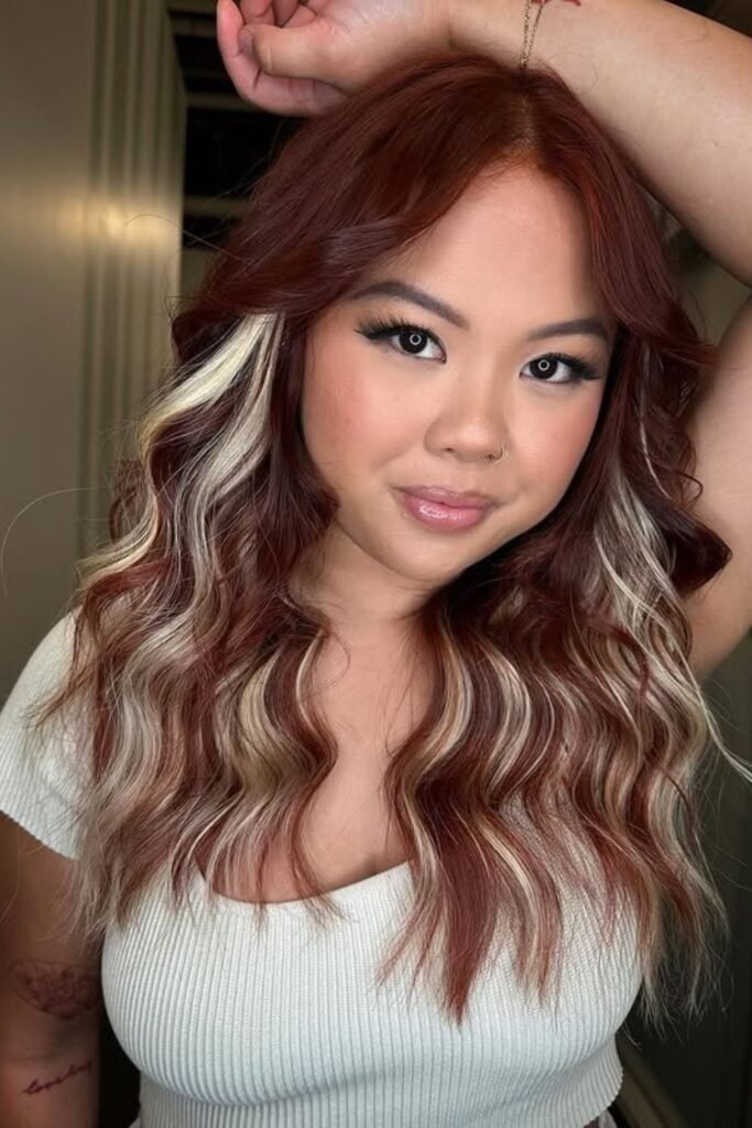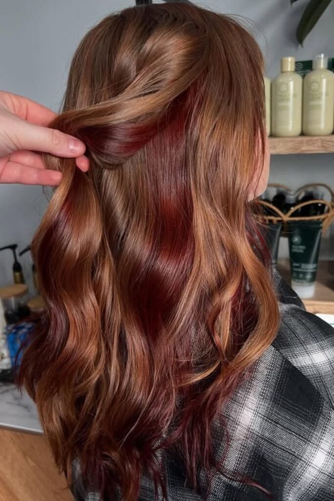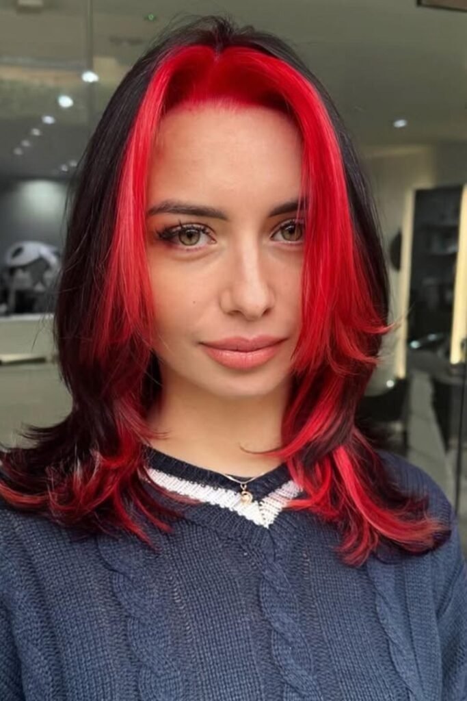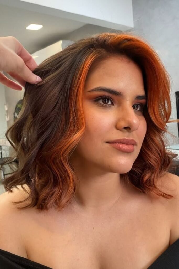 This style works best for people who like heat-based tones but do not want full red hair. It adds energy without taking over the look. It suits medium to thick hair because the layers help hide the color when needed.