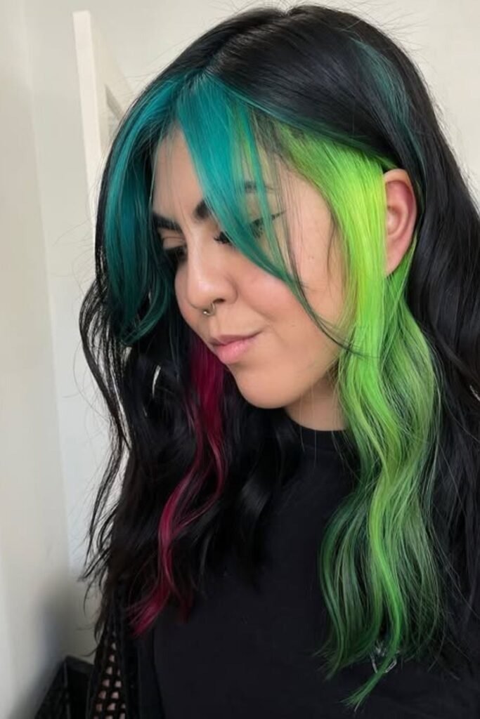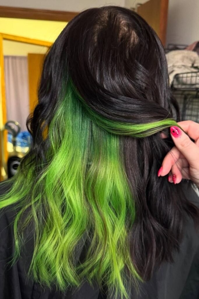 Electric green peekaboo uses a sharp green shade hidden under black or deep brown hair. The color shows best with layers or curls.