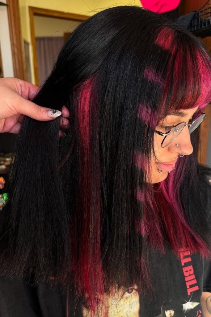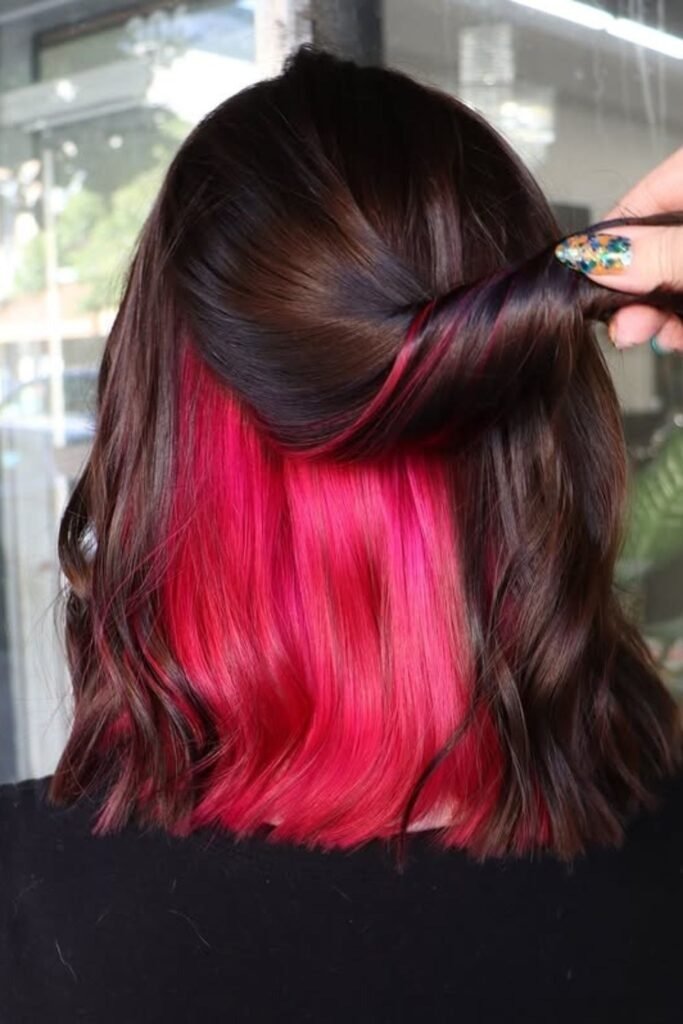 Hot pink underlayer peekaboo places a strong pink shade under dark or neutral hair. The contrast is clear but still controlled.