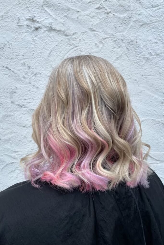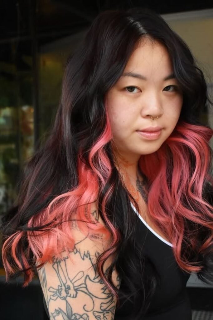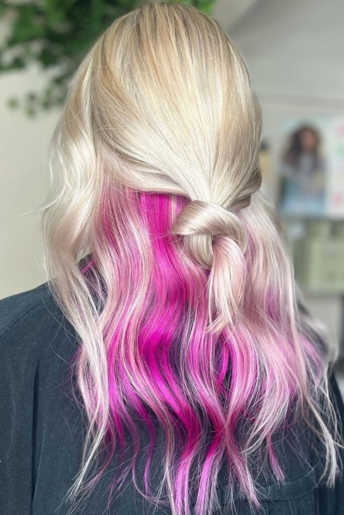 Pink pop underlayer uses bright pink hidden beneath natural hair. It is playful but controlled.