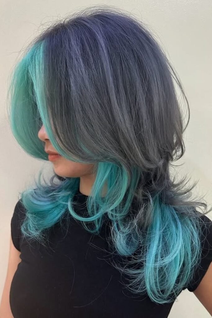 Teal layer peekaboo places blue-green color under the mid layers of hair. It shows with movement and layered cuts.