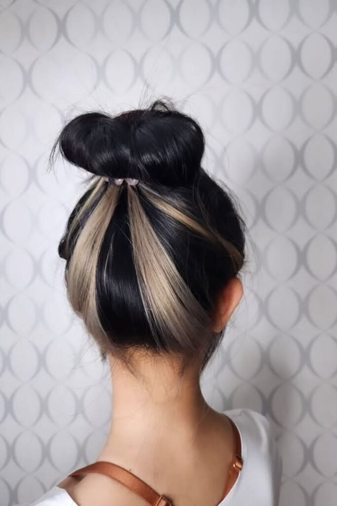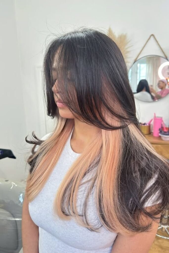 Face-framing blonde peekaboo hides light blonde pieces near the face. They show when hair moves forward.