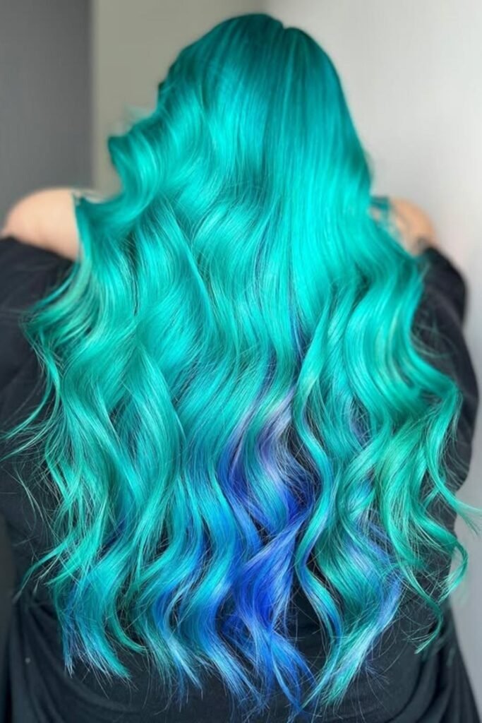 Teal-to-blue fade peekaboo blends two cool shades under the hair. The fade gives depth and smooth color change.