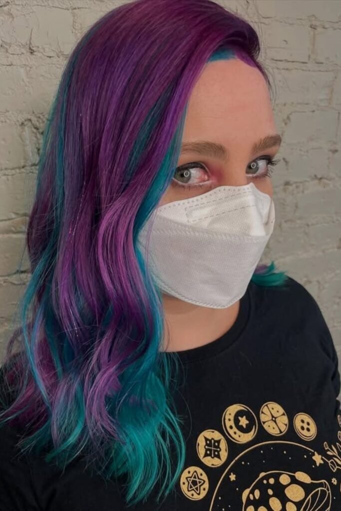 Purple-teal peekaboo blends cool tones for a calm but creative look. It works well under dark hair.