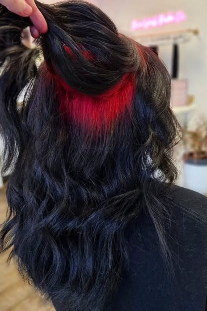 Wine red underlights are deep red tones placed under the main hair. They give a dark glow instead of a bright pop.