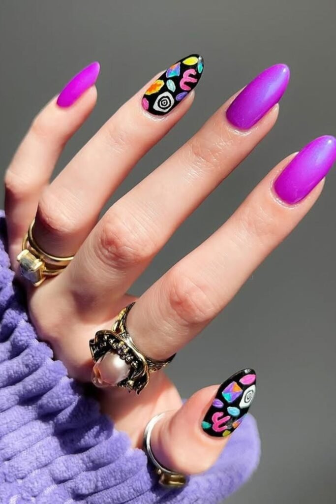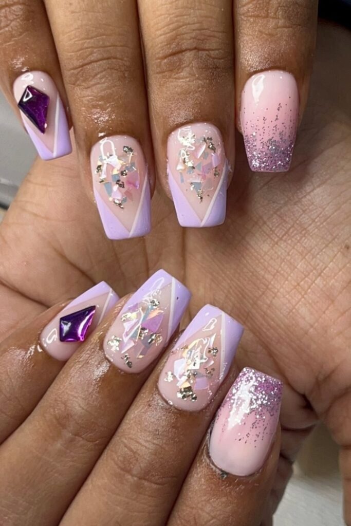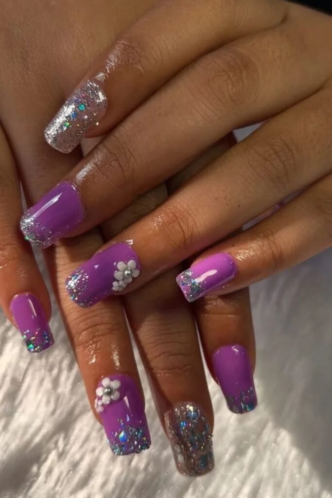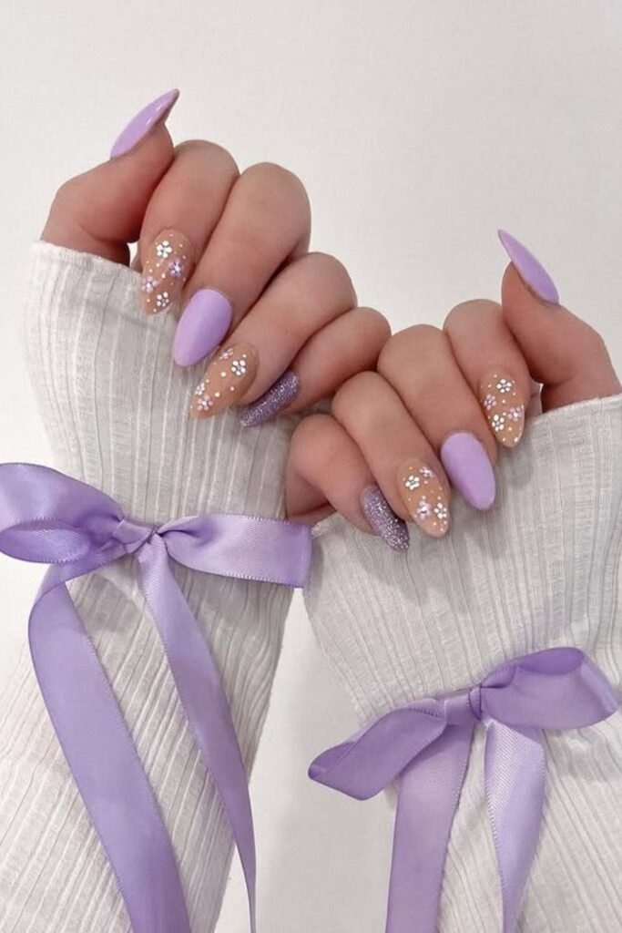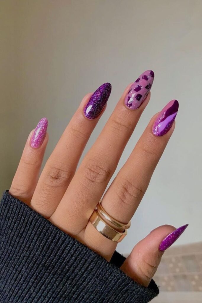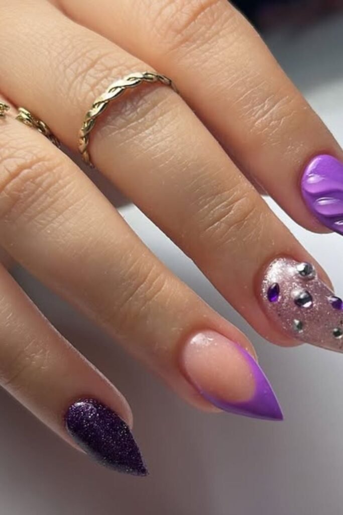 Mixed texture glam uses both glossy and matte purple on the same set. Some nails shine while others stay soft. This adds interest without extra color.