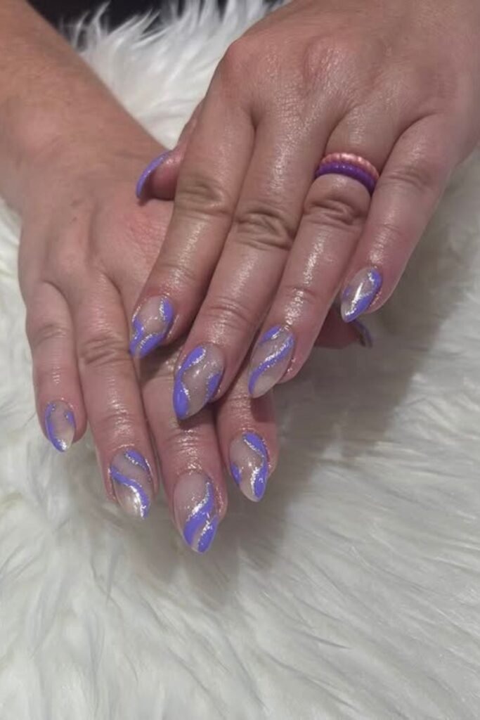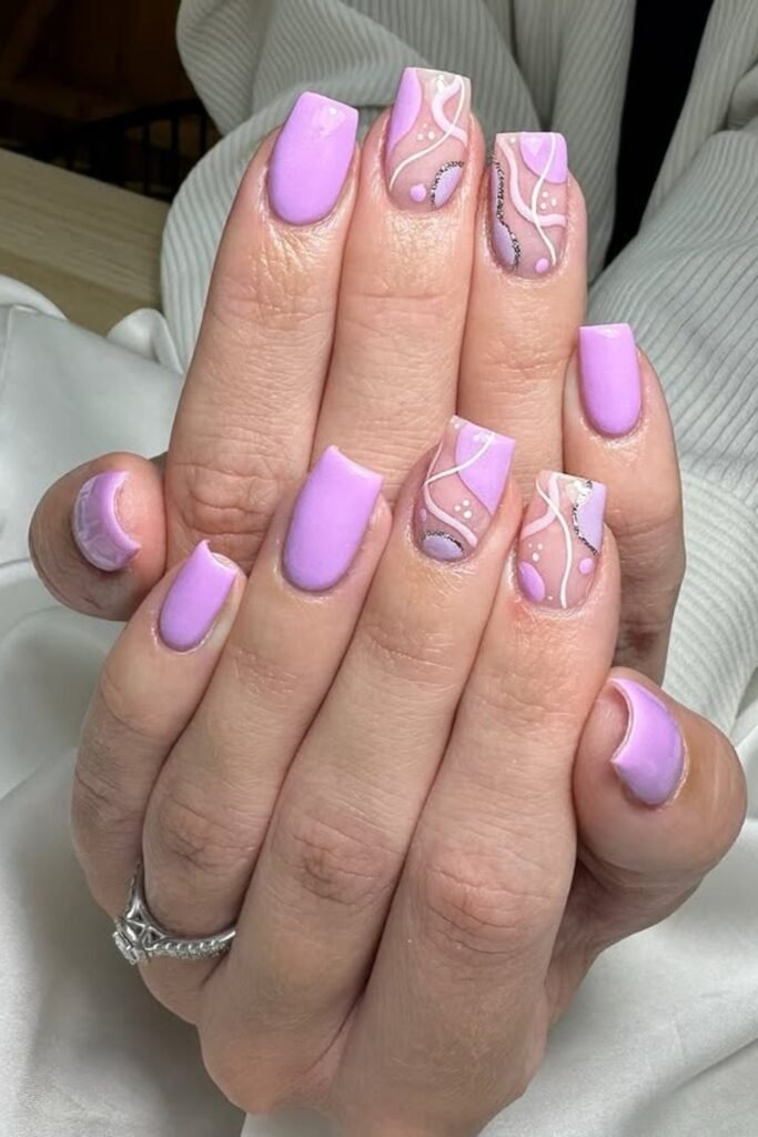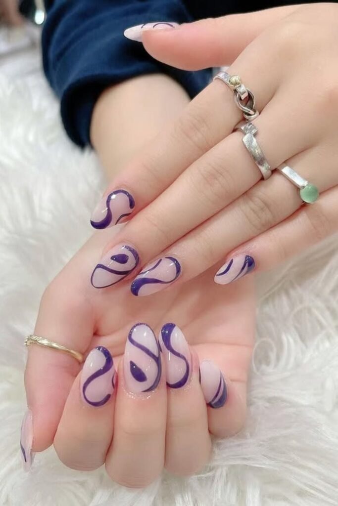 Lilac swirl nails use curved lines in different purple shades. The lines move across the nail in a soft flow. This gives motion without clutter.