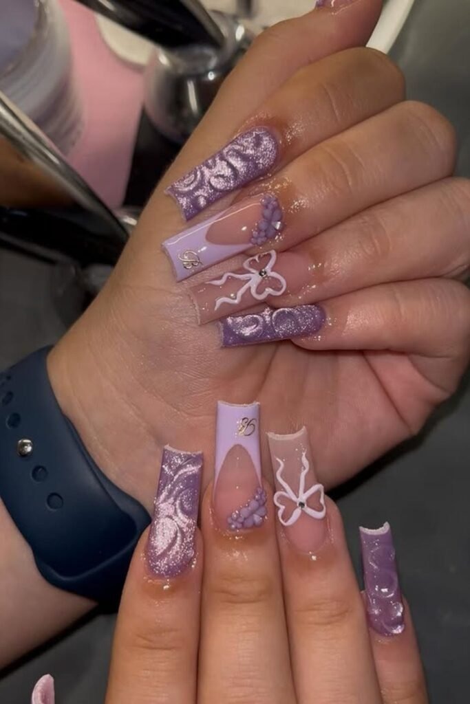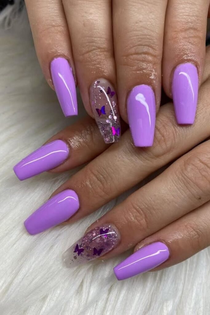 Butterfly glam sets mix purple shades with butterfly art and light shine. Each nail may have a different detail, but the colors stay close.