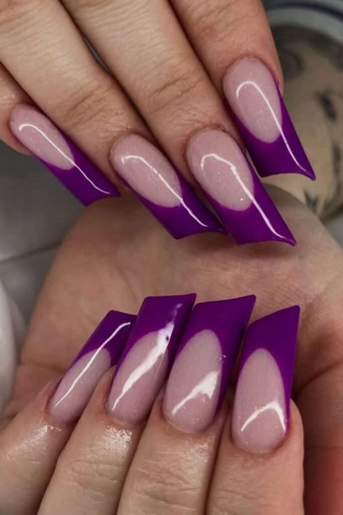 Bold V-tip nails use a sharp V shape at the tip with a deep purple color. The base is usually nude or clear. This creates a strong contrast.