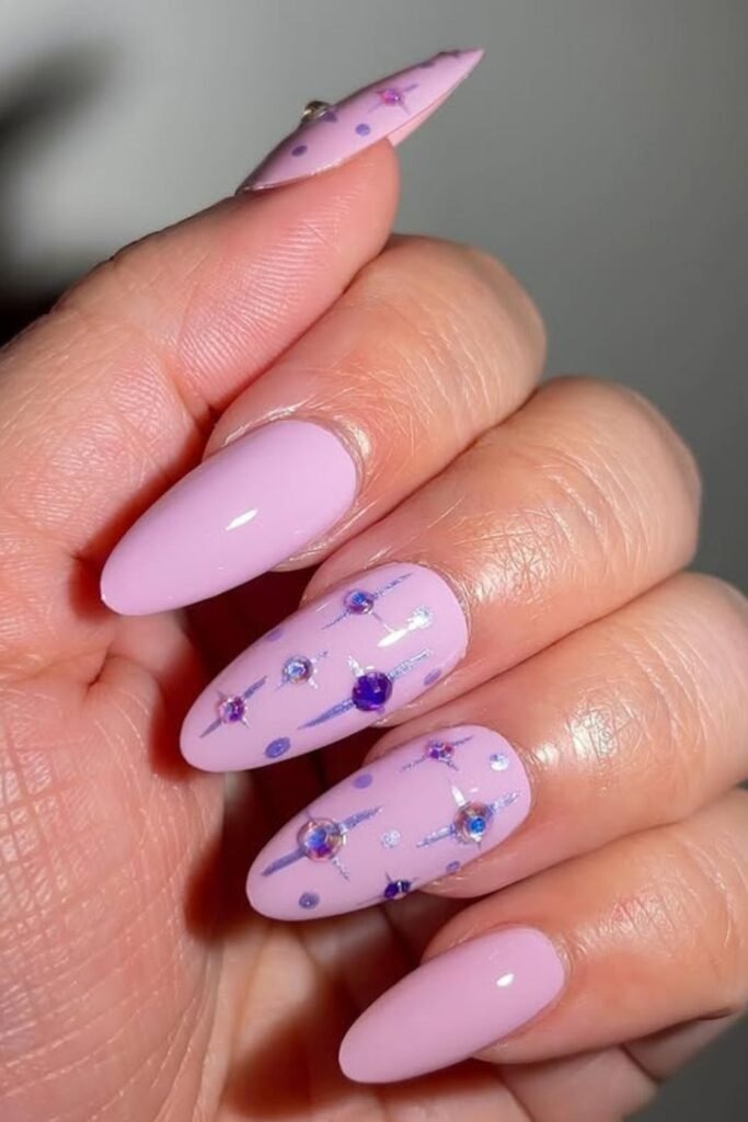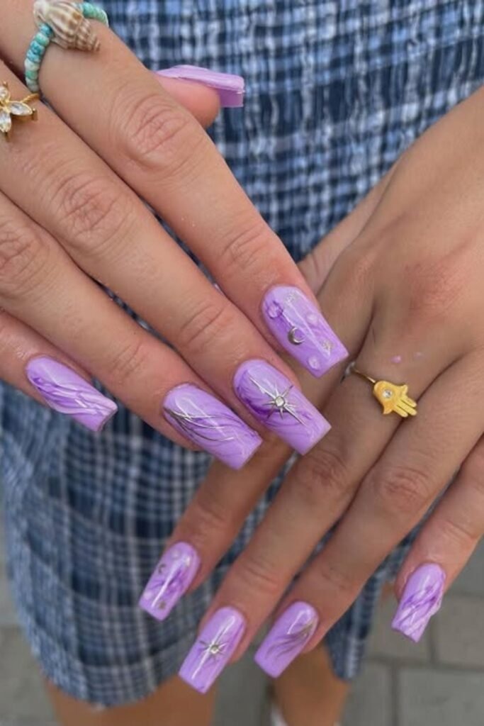Starry lilac nails feature tiny star shapes over a light purple base. The stars are often silver or white. The finish is glossy or slightly shiny.