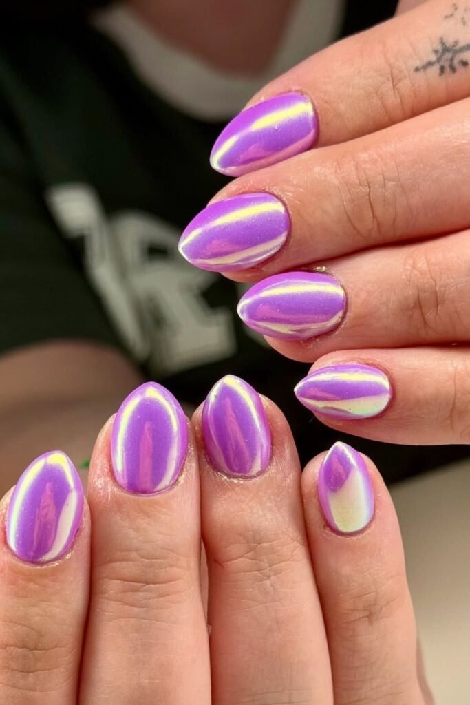 Holographic purple nails change color in light. The base is purple, but it reflects soft rainbow tones. The finish is smooth and clean.