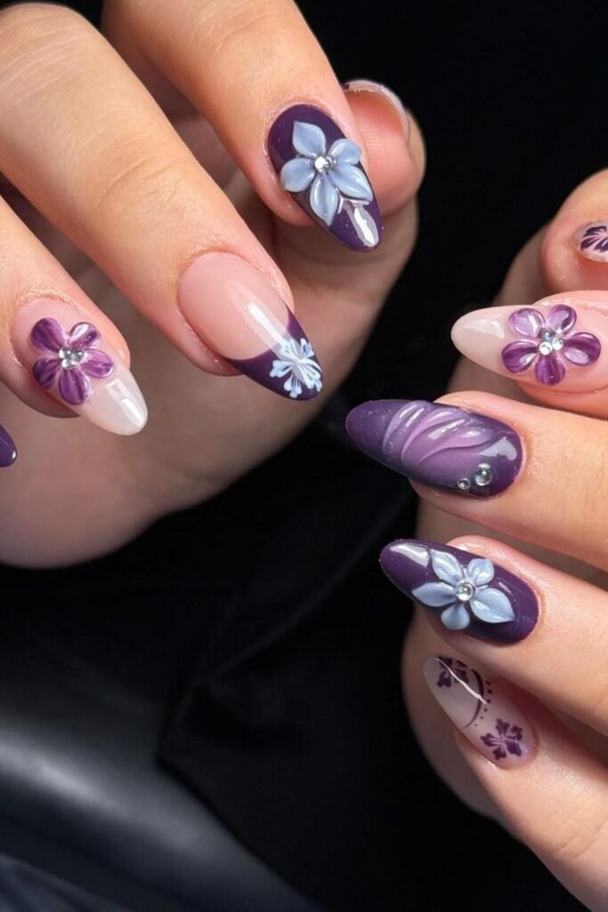 3D floral nails add raised flower shapes over a purple base. The flowers are kept small to avoid heaviness.