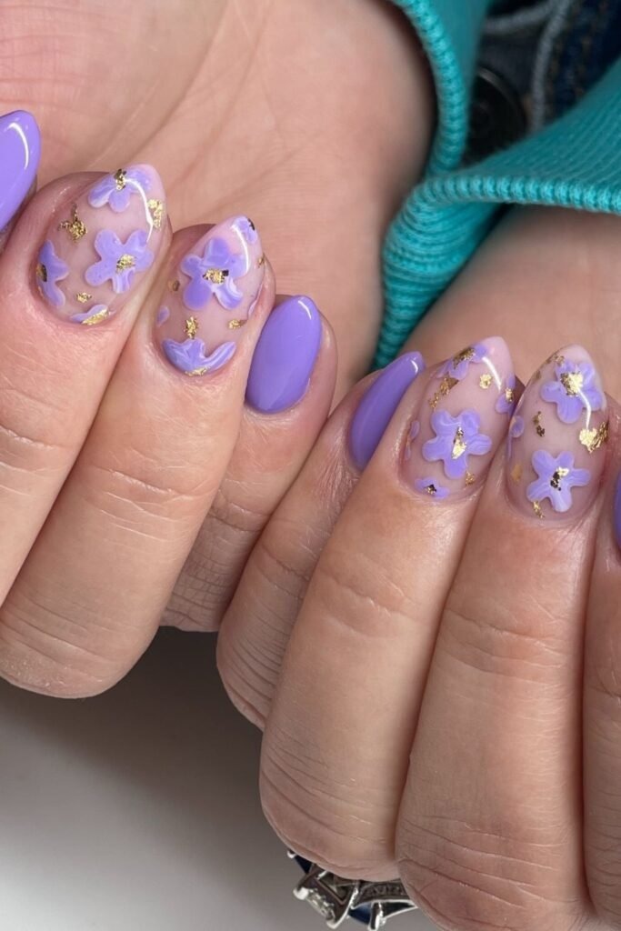 Golden petal nails mix purple with small gold petal shapes. The gold is flat and smooth, not raised.