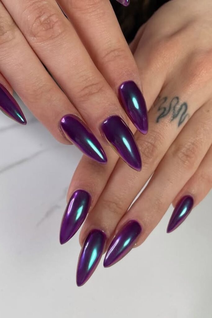 Chrome ombre purple blends two purple tones with a shiny chrome finish. The color fades smoothly from light to dark. The shine adds depth without looking heavy.