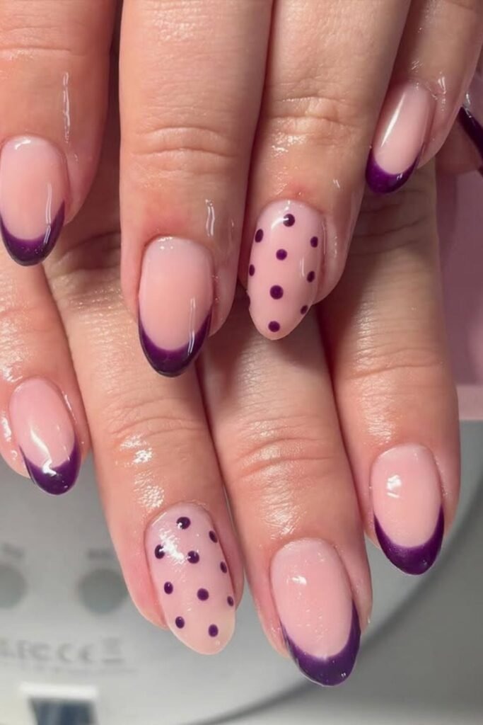 Polka dot French nails use a purple base with small dots near the tips. The dots are neat and spaced.