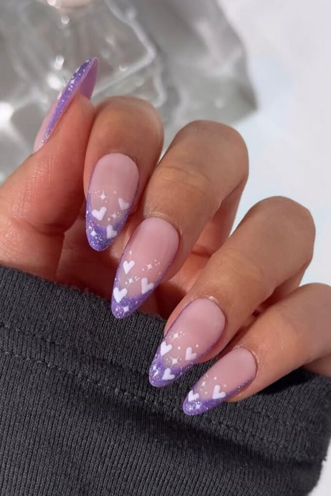 Sparkly heart tips feature small heart shapes at the nail tips over a purple base. The hearts use soft glitter.