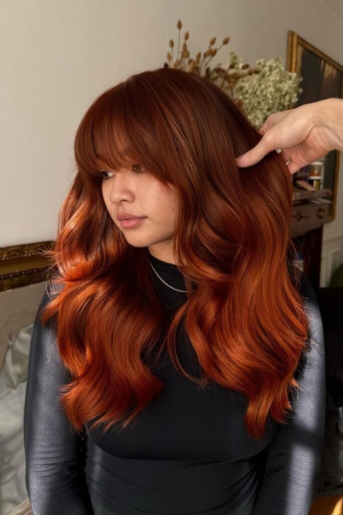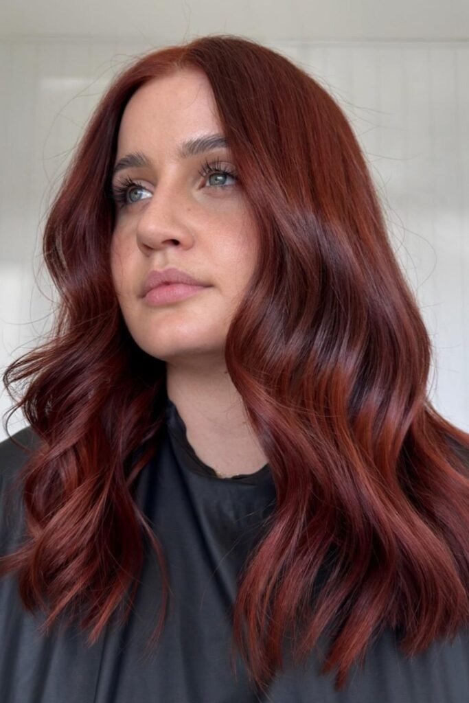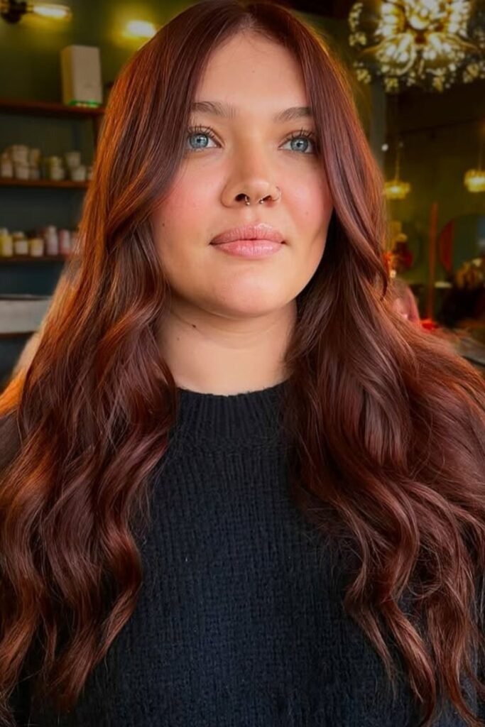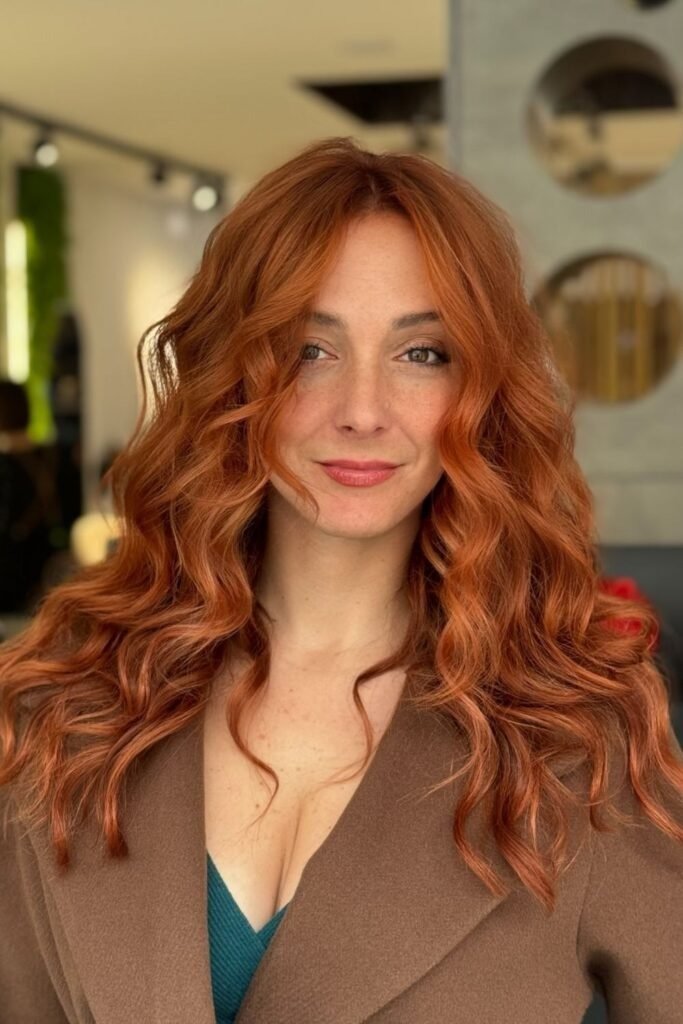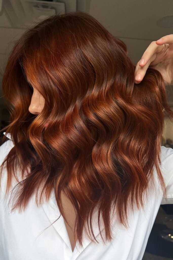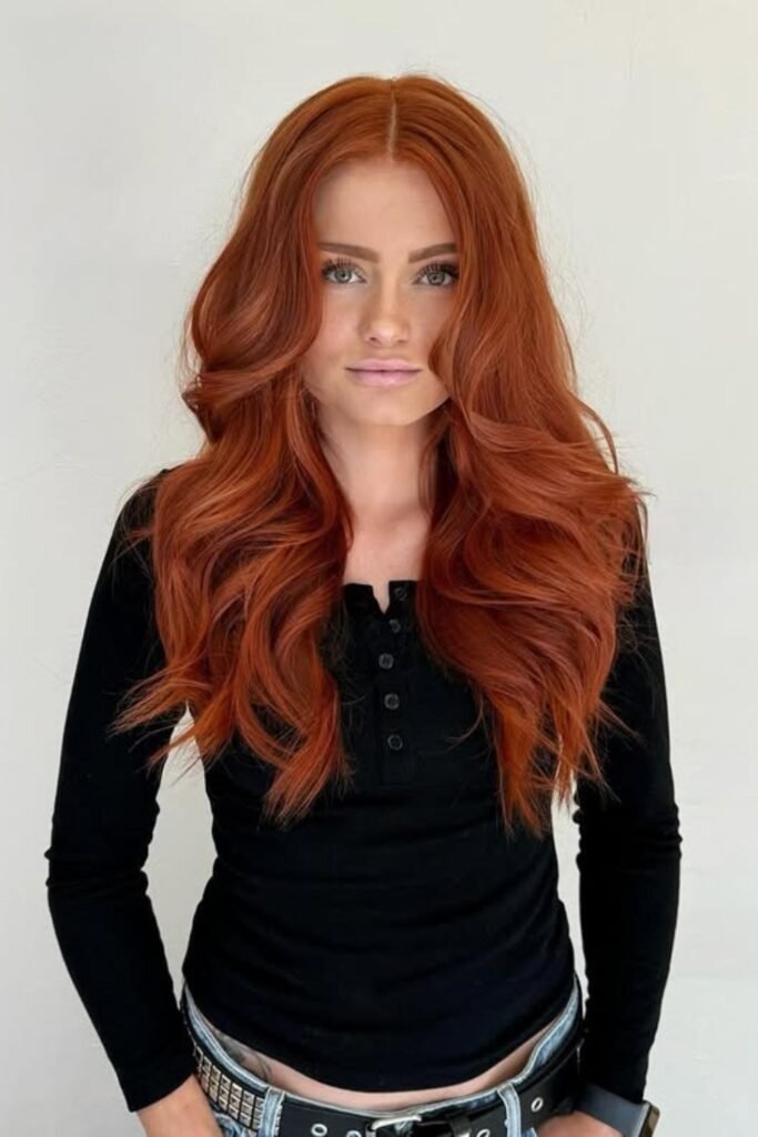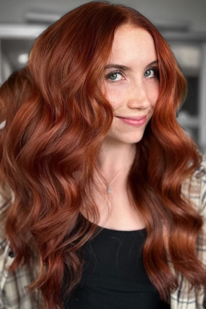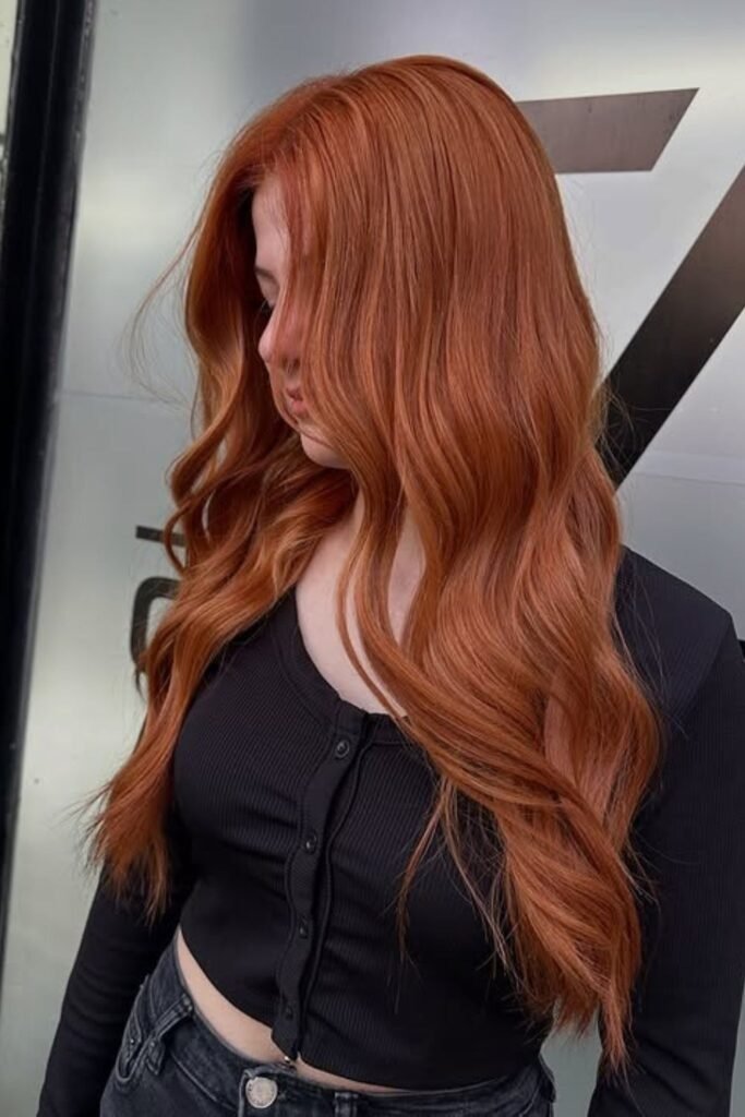 Copper waves bring movement and shine together. This style looks best on medium to long hair where the waves catch light from different angles. The copper tone is even from root to tip, but the waves make it look layered. This shade feels warm and relaxed, perfect for everyday wear. It suits most skin tones and works well for people who want color without going too bold.