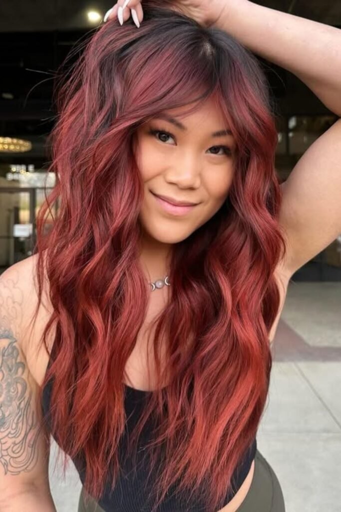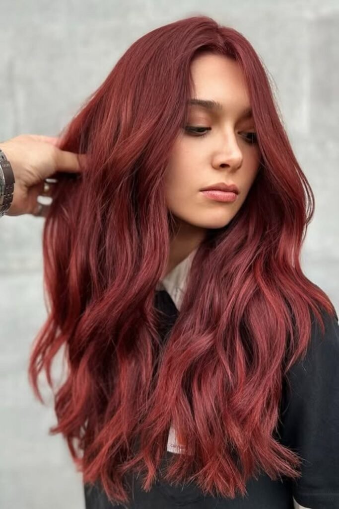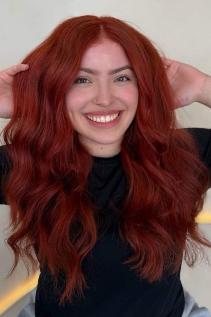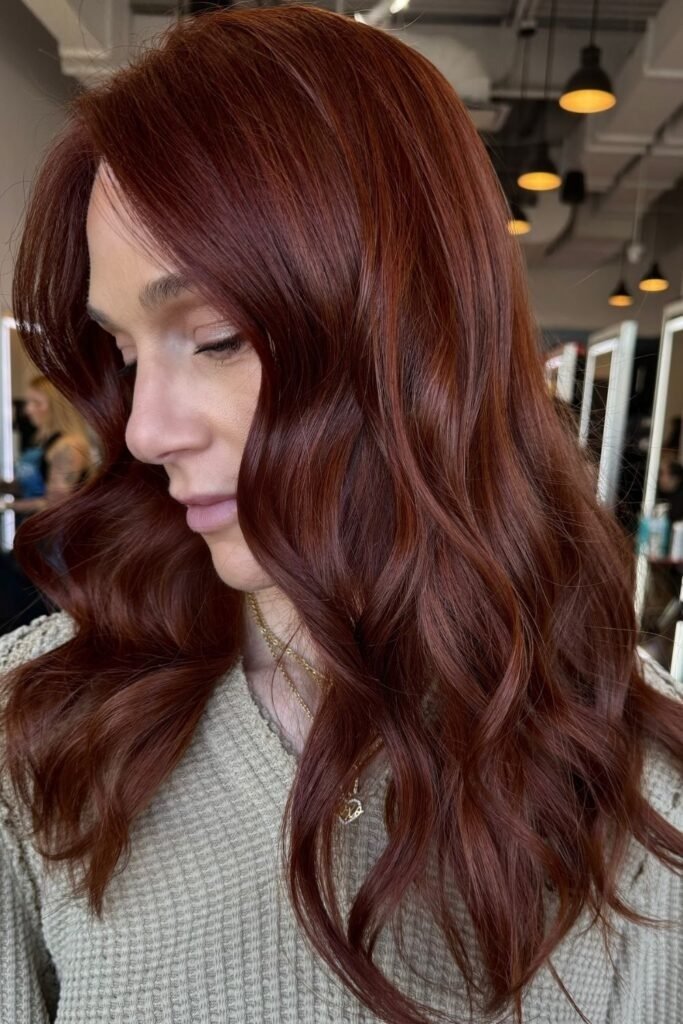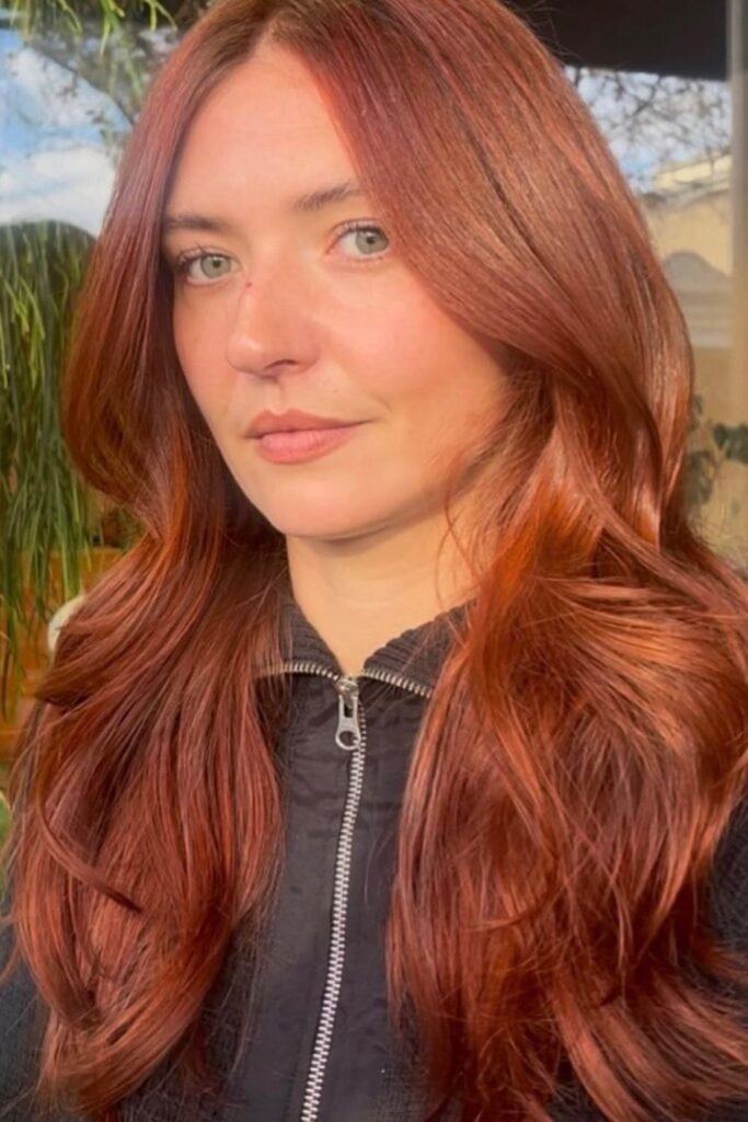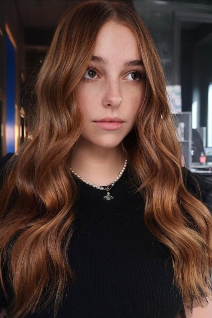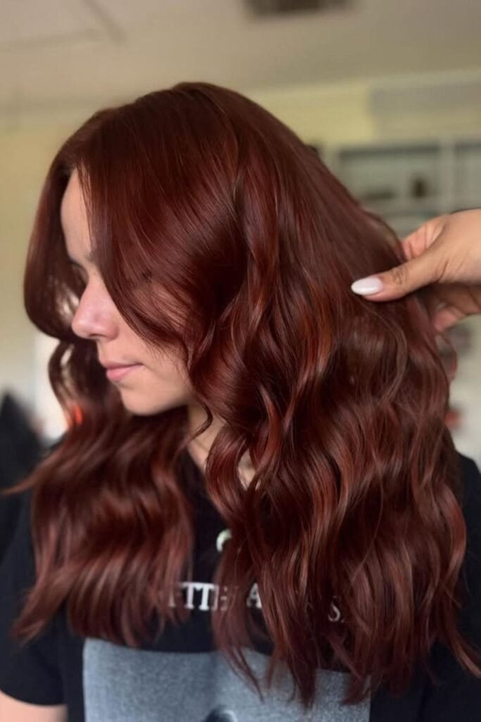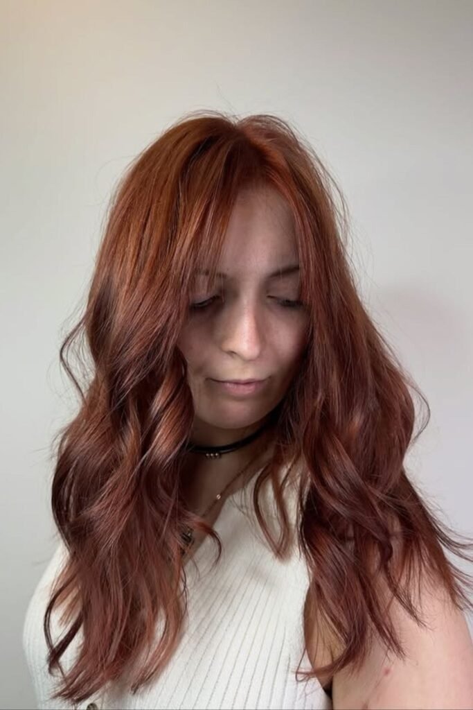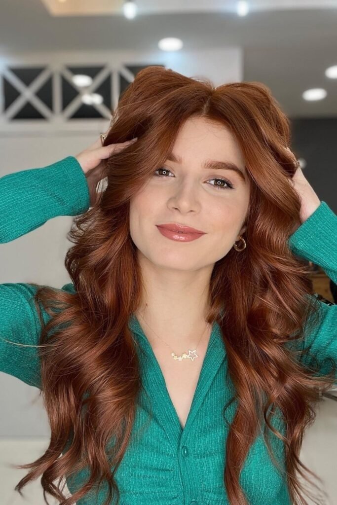 Copper waves bring movement and shine together. This style looks best on medium to long hair where the waves catch light from different angles. The copper tone is even from root to tip, but the waves make it look layered. This shade feels warm and relaxed, perfect for everyday wear. It suits most skin tones and works well for people who want color without going too bold.