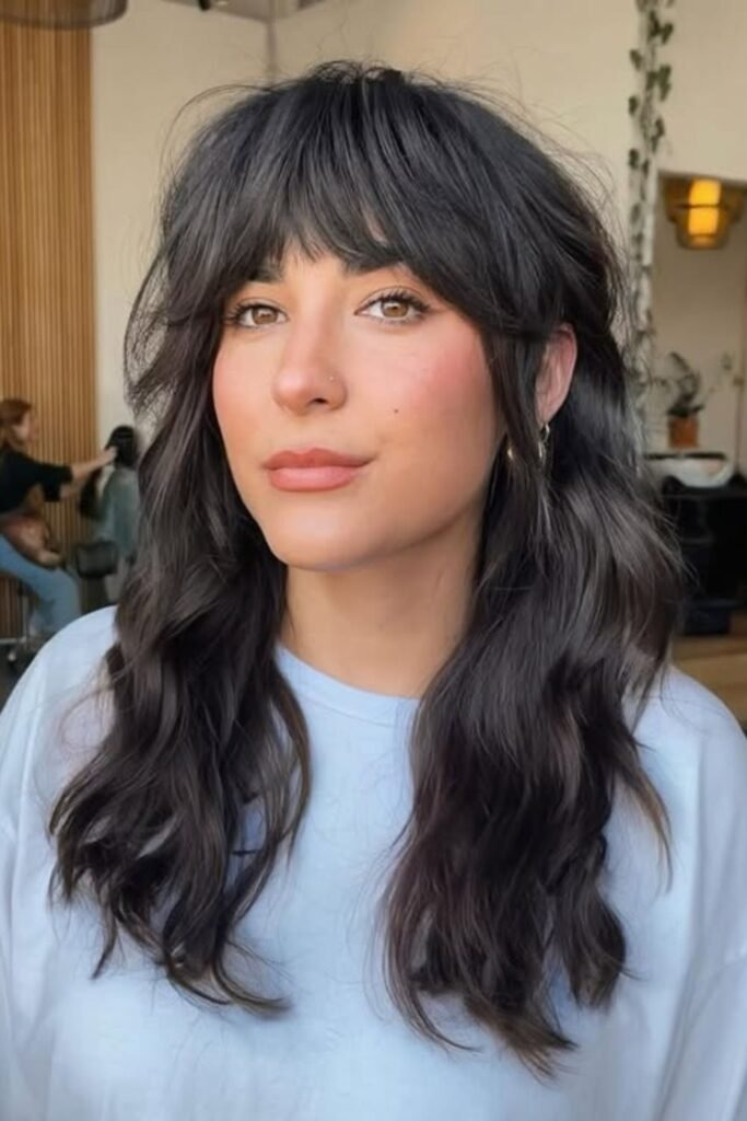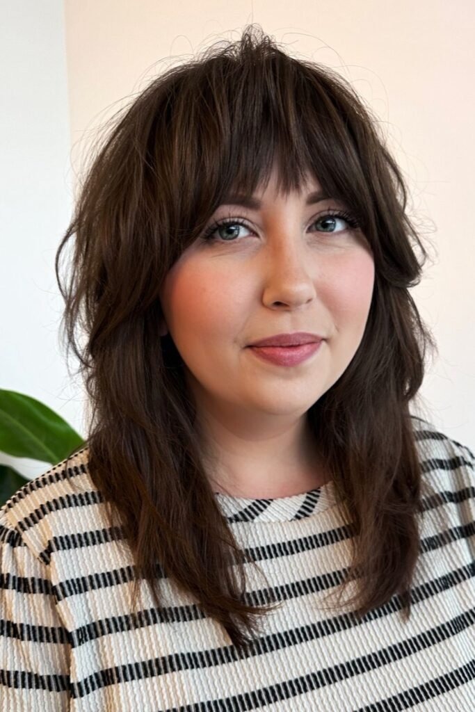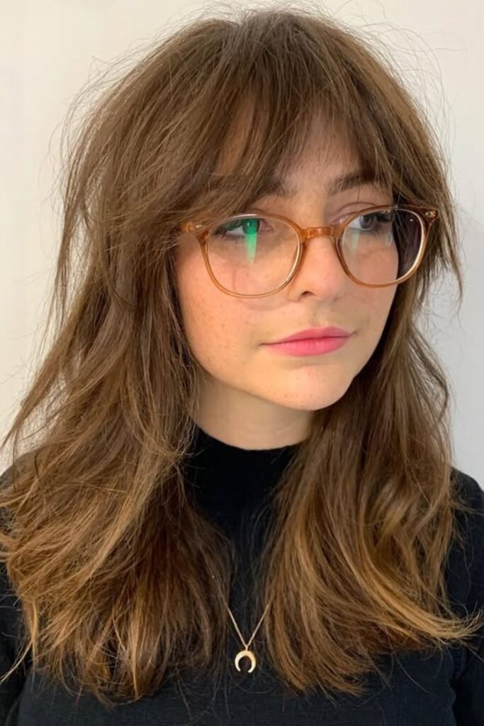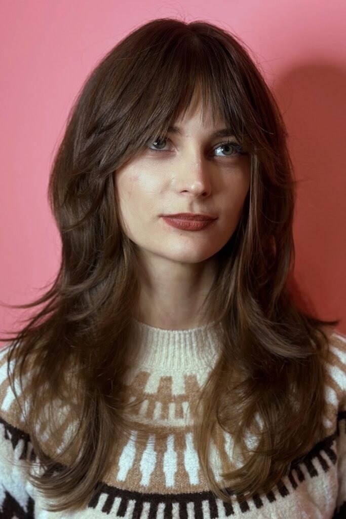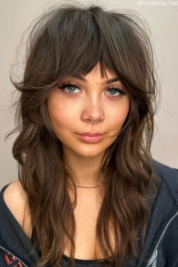 The long fringe shag uses bangs that reach the eyes or cheekbones. These bangs blend into the rest of the cut instead of sitting heavy on the forehead. This creates a smooth frame around the face.