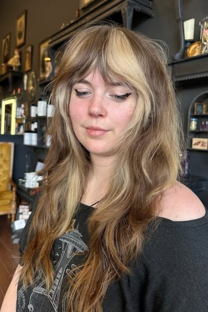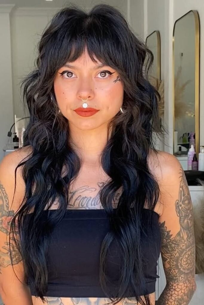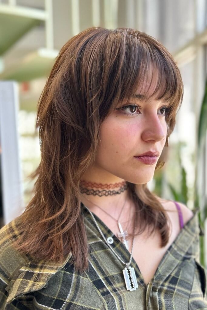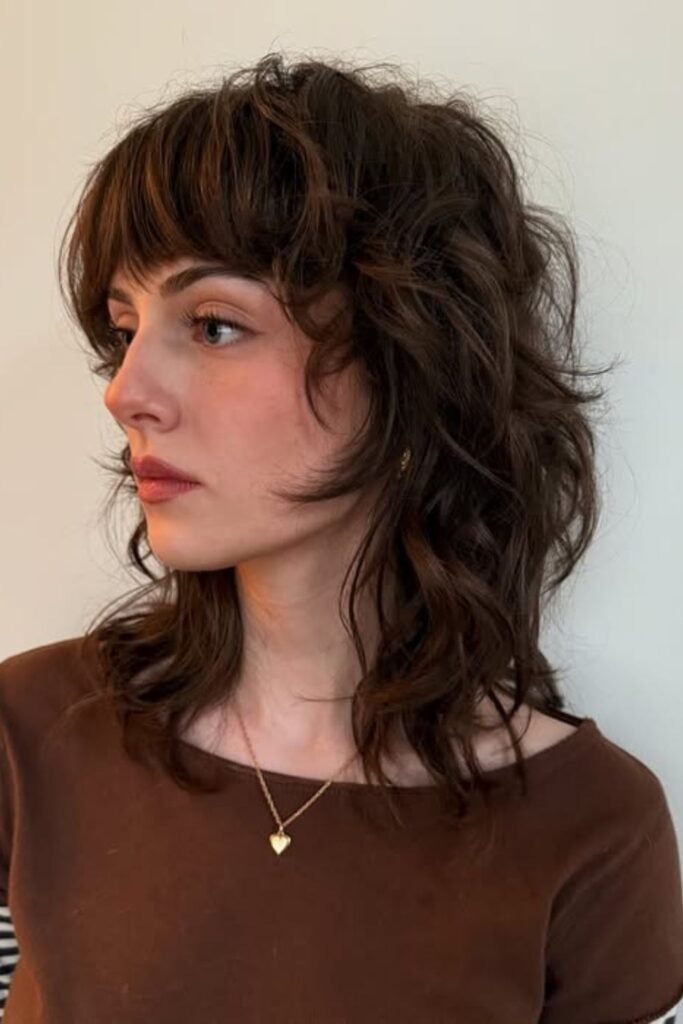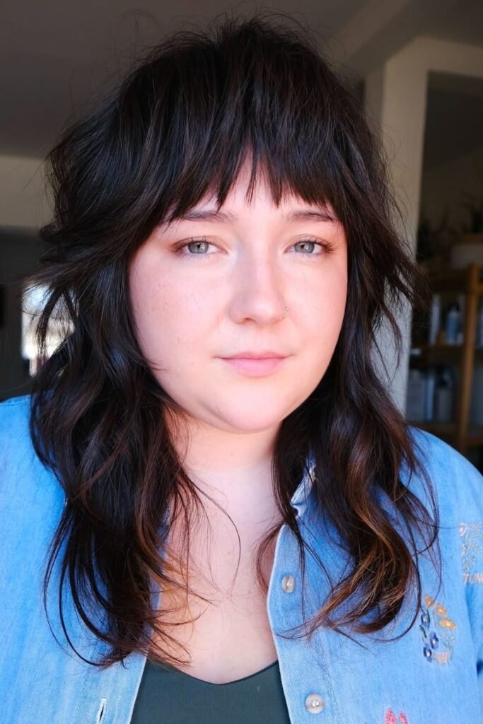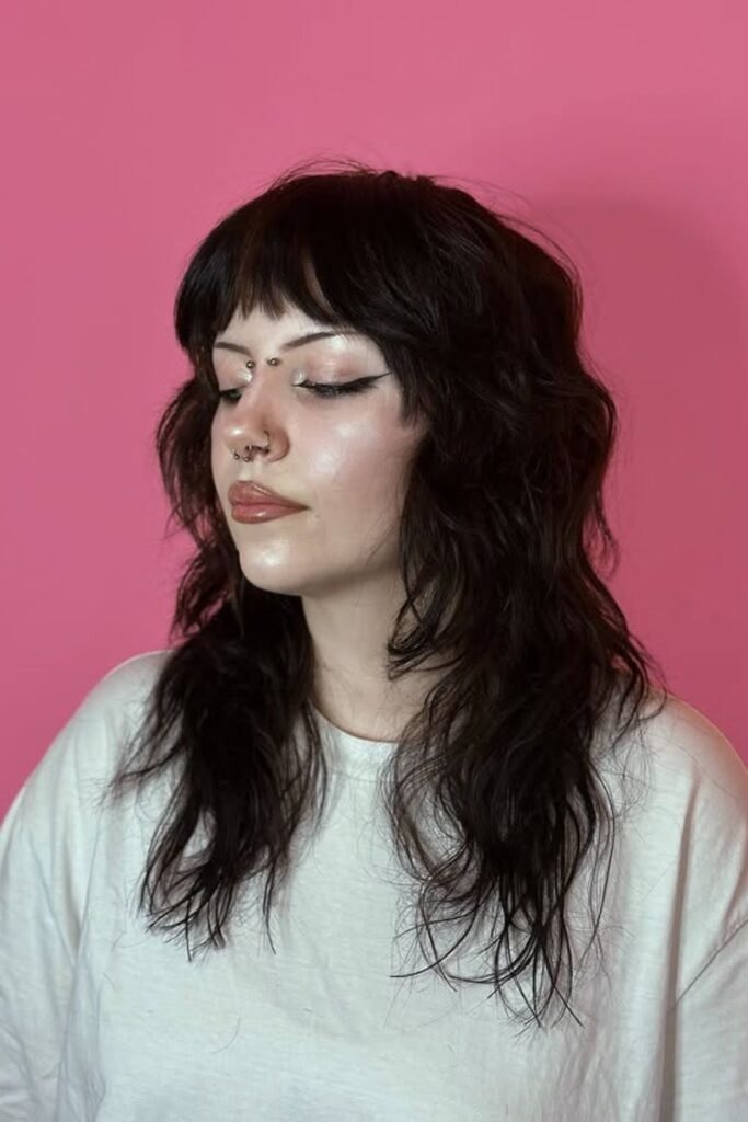 The long fringe shag uses bangs that reach the eyes or cheekbones. These bangs blend into the rest of the cut instead of sitting heavy on the forehead. This creates a smooth frame around the face.