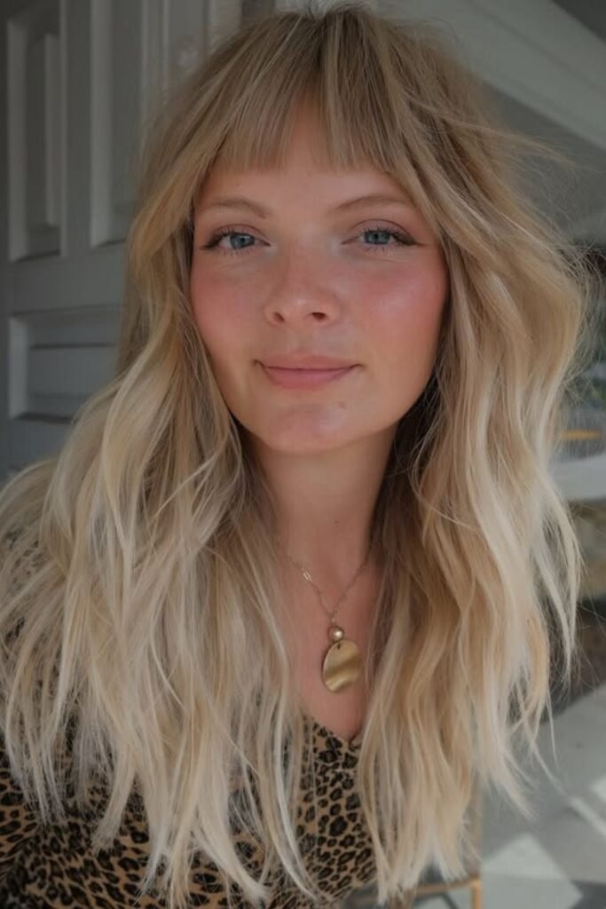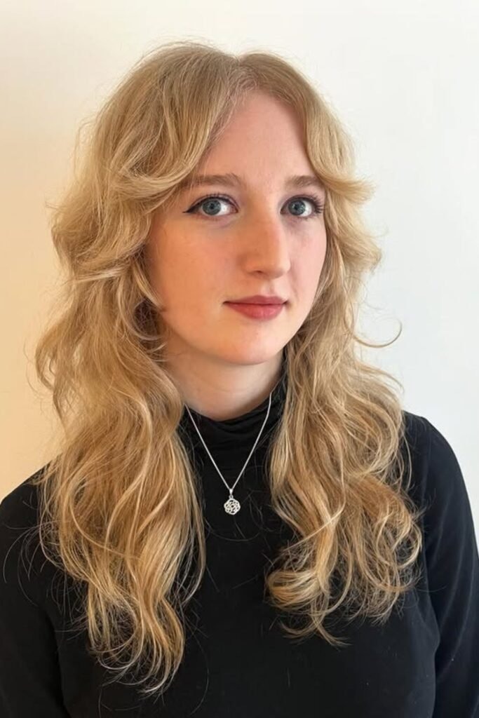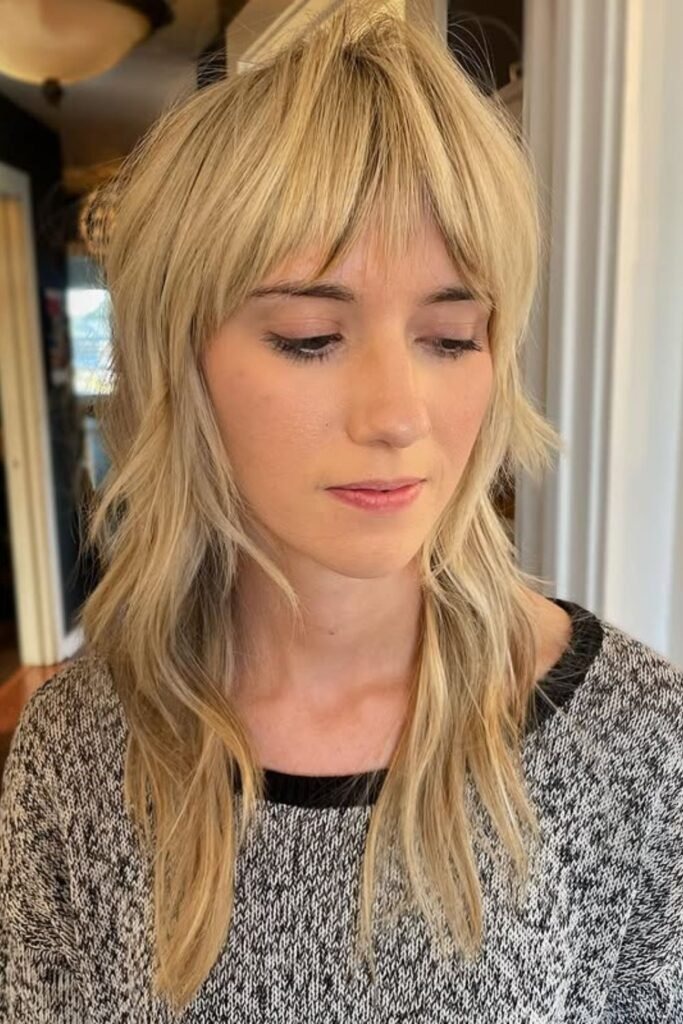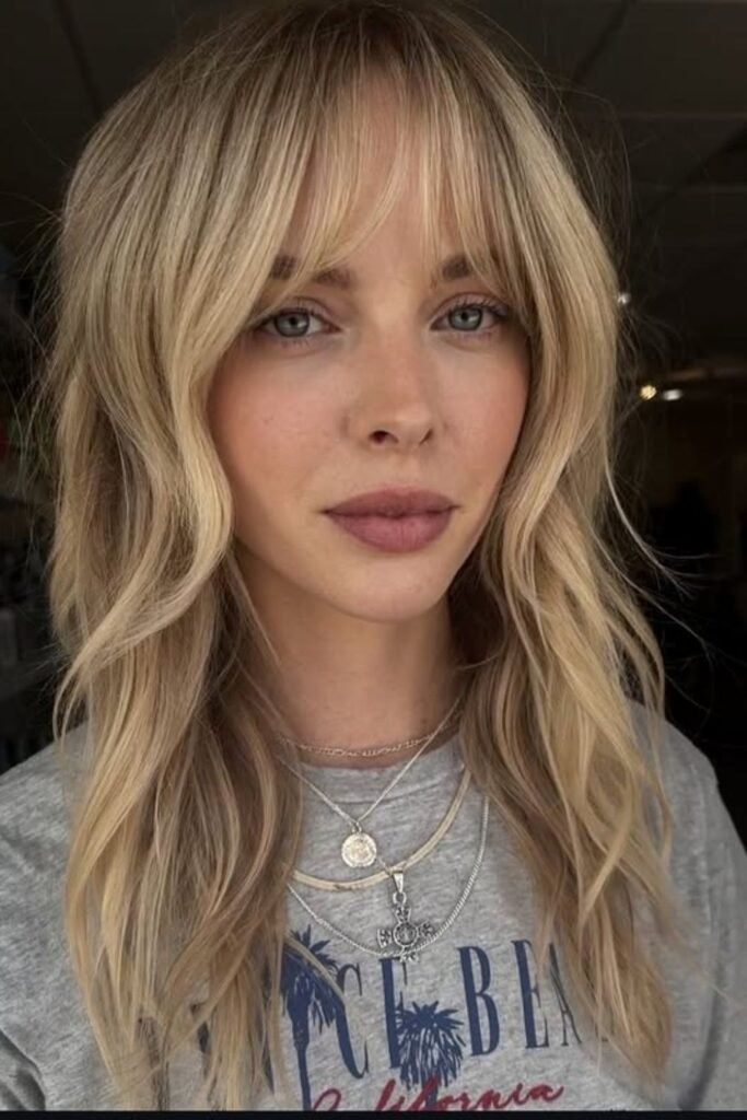 This style blends soft blonde tones with curtain bangs and layered length. The light color highlights the layers and adds dimension.
