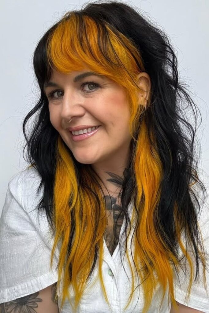 The bold split shag uses a strong center part with clear layering on both sides. It creates symmetry while keeping movement.