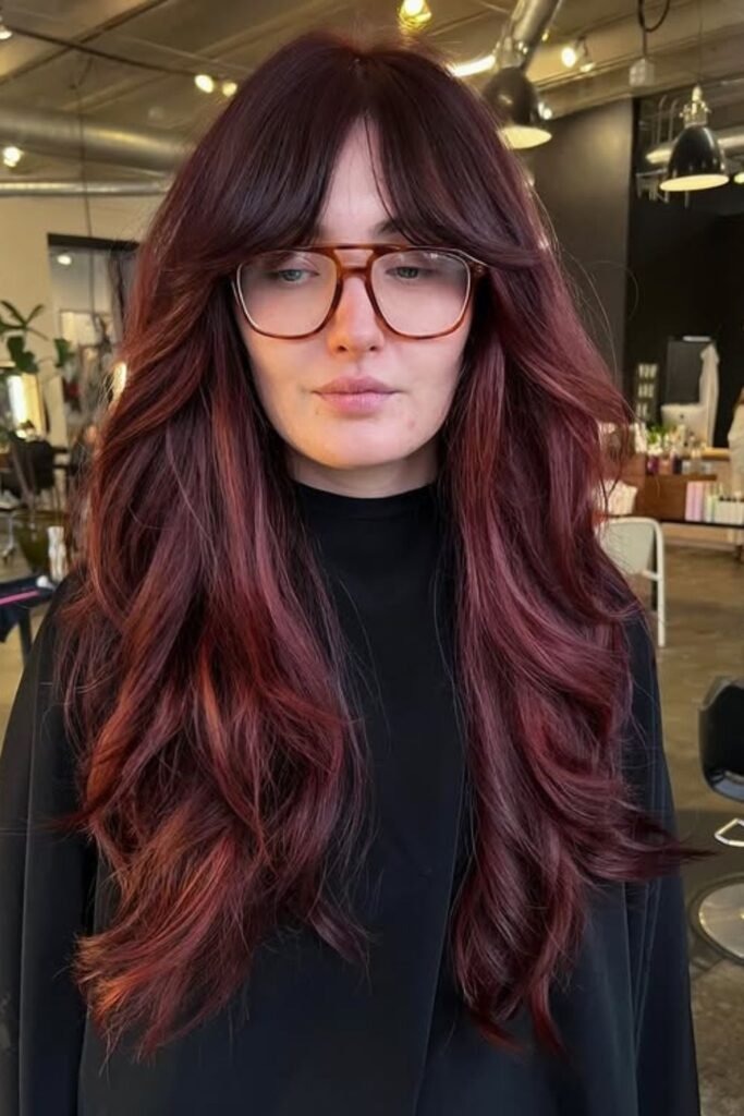 Deep wine shades pair with soft layers for a smooth finish. The color adds depth while the cut keeps movement.