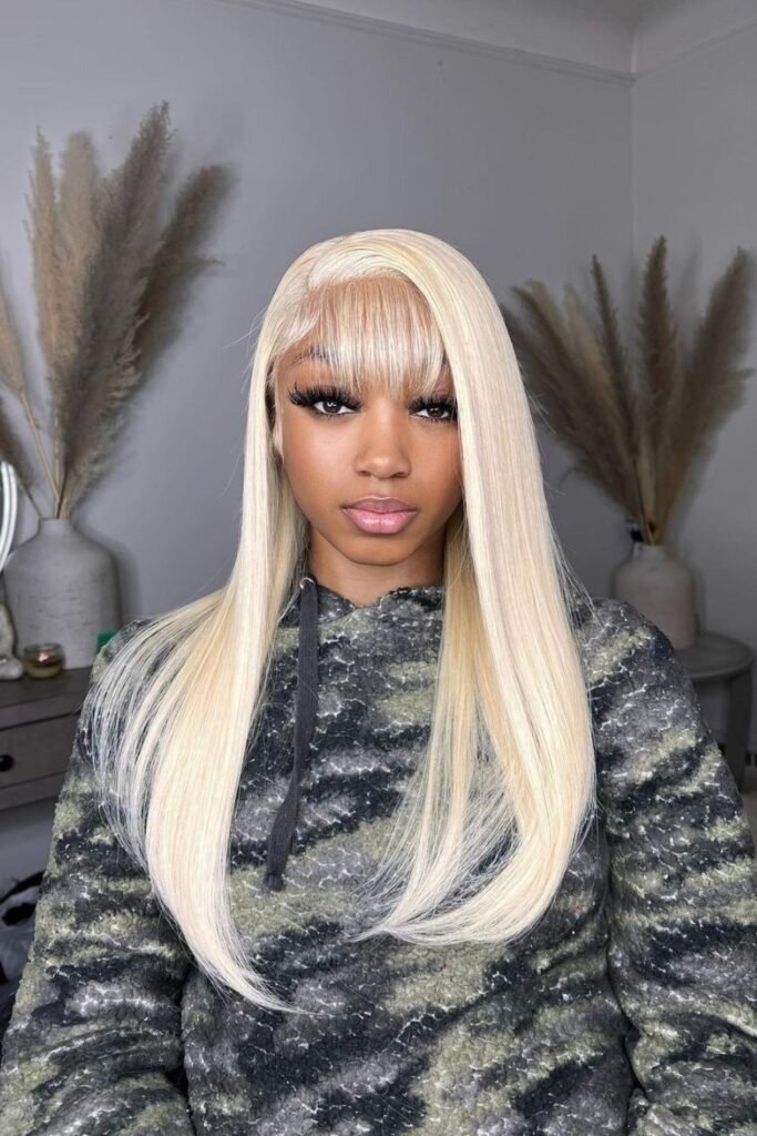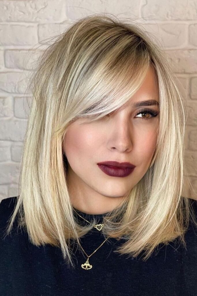 A blunt bob with side part bangs creates contrast. The ends of the hair stay sharp, while the bangs add softness. The side part prevents the look from feeling too severe. This style works well for short to medium lengths and gives a clean, modern feel.