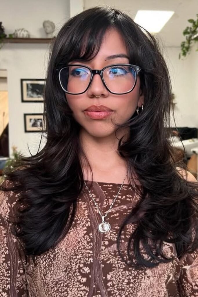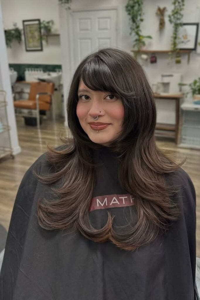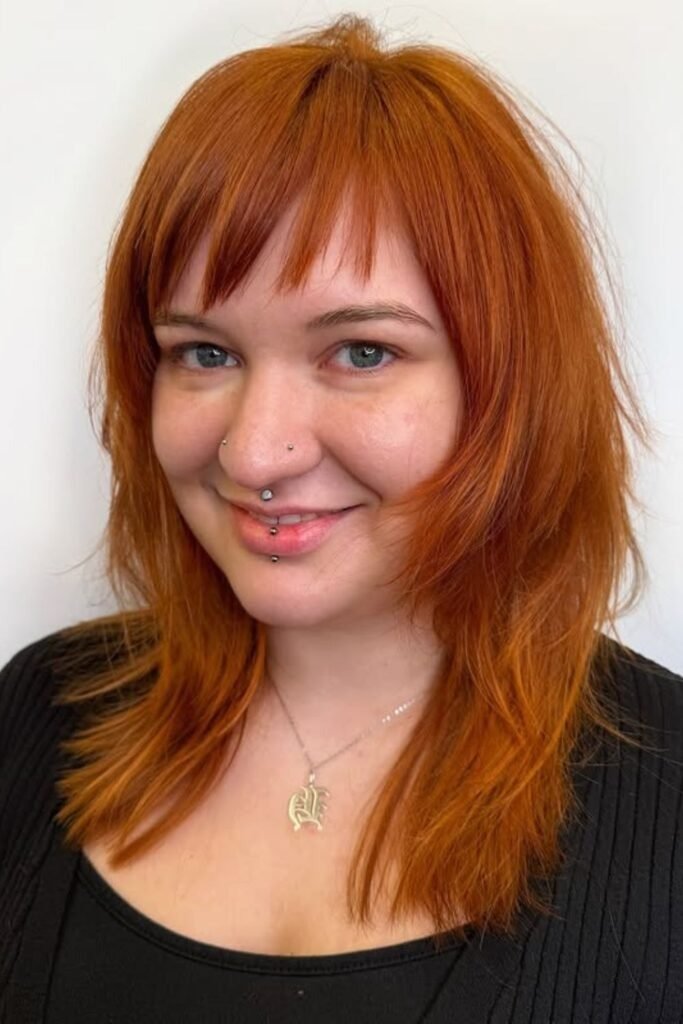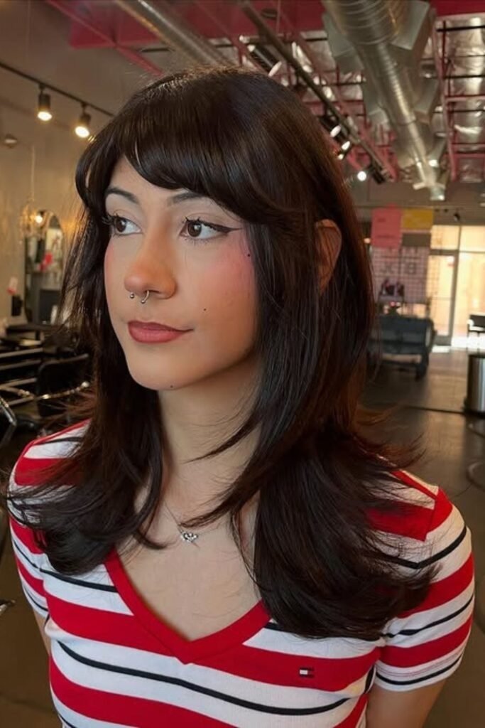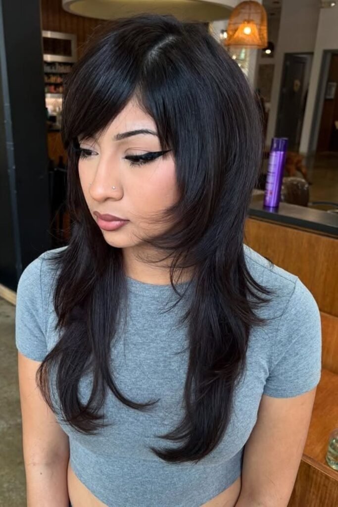 Shag layers with side part bangs bring a casual, lived-in feel. The bangs are light and broken up, never solid. They blend into choppy layers that add movement. This style works well on medium hair and suits people who prefer low-effort styling. It looks good even when slightly messy.