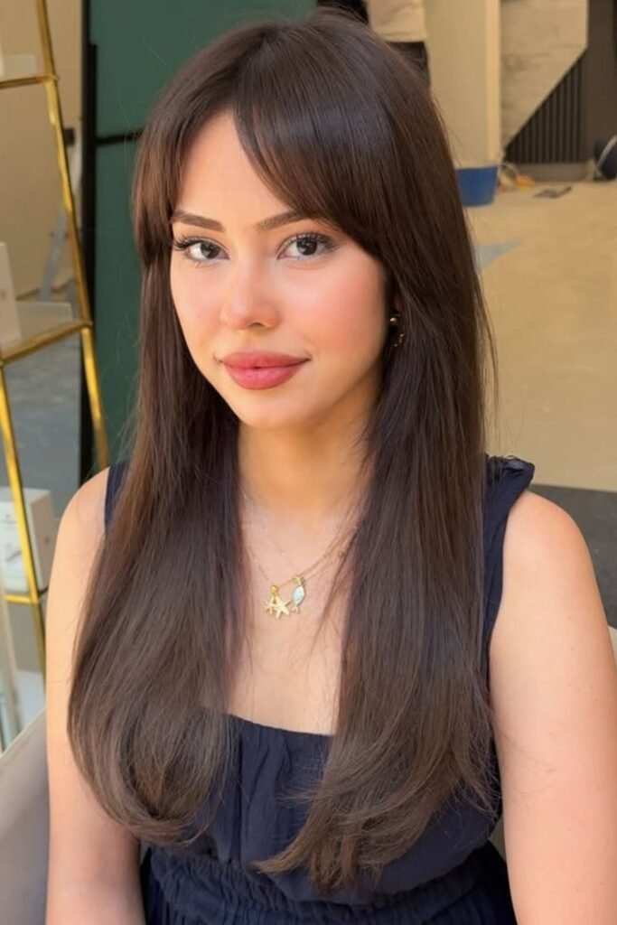 Soft length focuses on keeping the hair long while adding gentle framing. The side part bangs are subtle and flow into the front sections. This avoids harsh lines and keeps the look calm. It is ideal for those who want minimal change but better shape around the face.