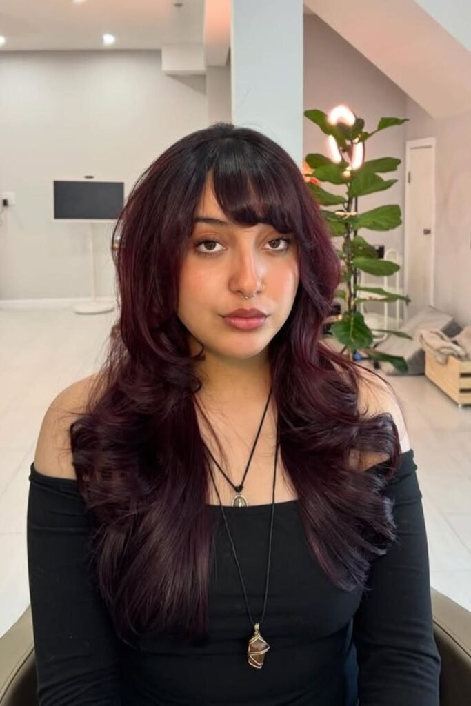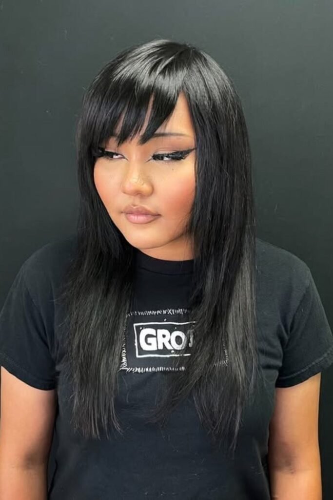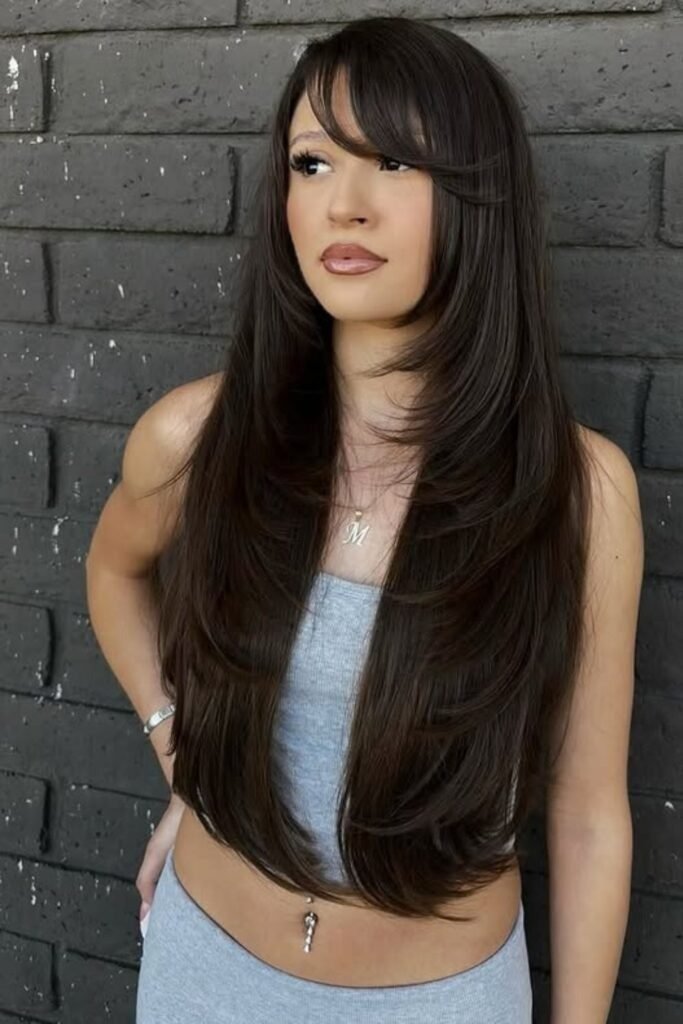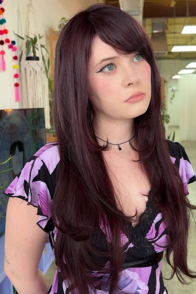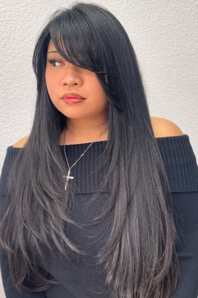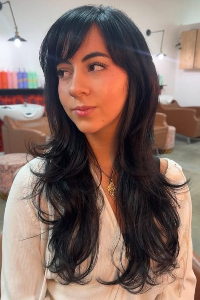 Long hair with side part bangs can look bold without being loud. The bangs stay long enough to blend into the length, often reaching the cheek or jaw. This creates a strong flow from front to back. The side part keeps the bangs from feeling heavy. It works well for people who want a noticeable change without cutting length.