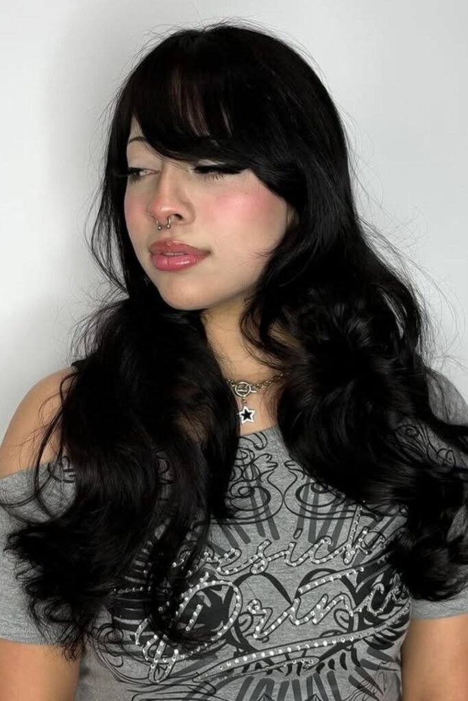 Side part bangs with soft waves feel timeless. The bangs move with the waves instead of sitting flat. This creates harmony between the fringe and the rest of the hair. It suits medium to long hair and works well for casual and formal settings alike.