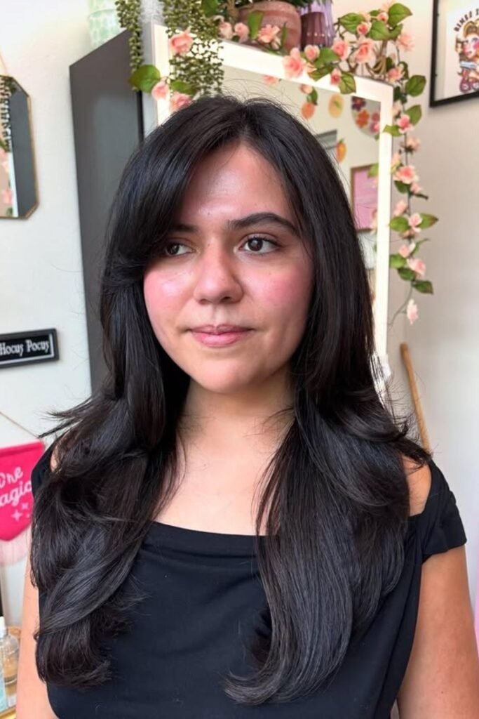 Soft layers with side part bangs create a gentle shape that moves easily. The bangs fall into the front layers and do not stand apart from the haircut. This works well for medium to long hair where you want light movement without volume overload. The side part helps the bangs rest naturally, even when air-dried. This style suits everyday wear and grows out cleanly.