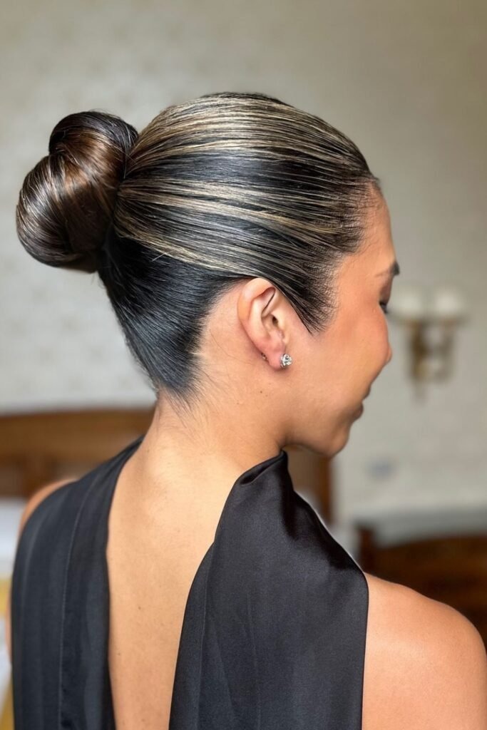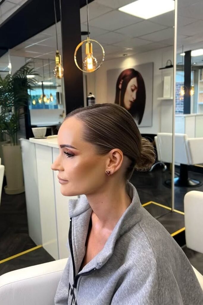 The sculpted sleek bun focuses on shape. Hair is smoothed back carefully, with attention to the curve of the head. The bun is placed to enhance balance and posture.