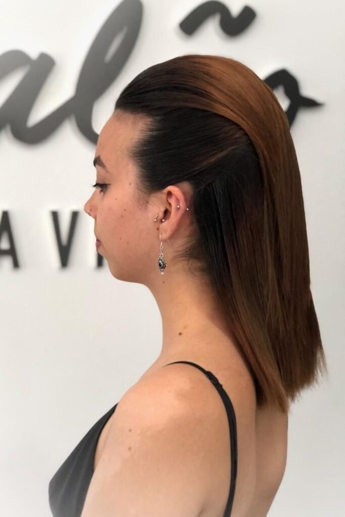Side-slick glam adds drama without being loud. Hair is slicked back with a deep side direction, creating shape and lift on one side. The rest of the hair is kept smooth or lightly waved.