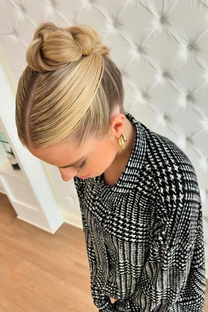 It works best on medium-length hair. The small bun keeps the style light and easy to wear. It is ideal for professional settings or minimal looks.