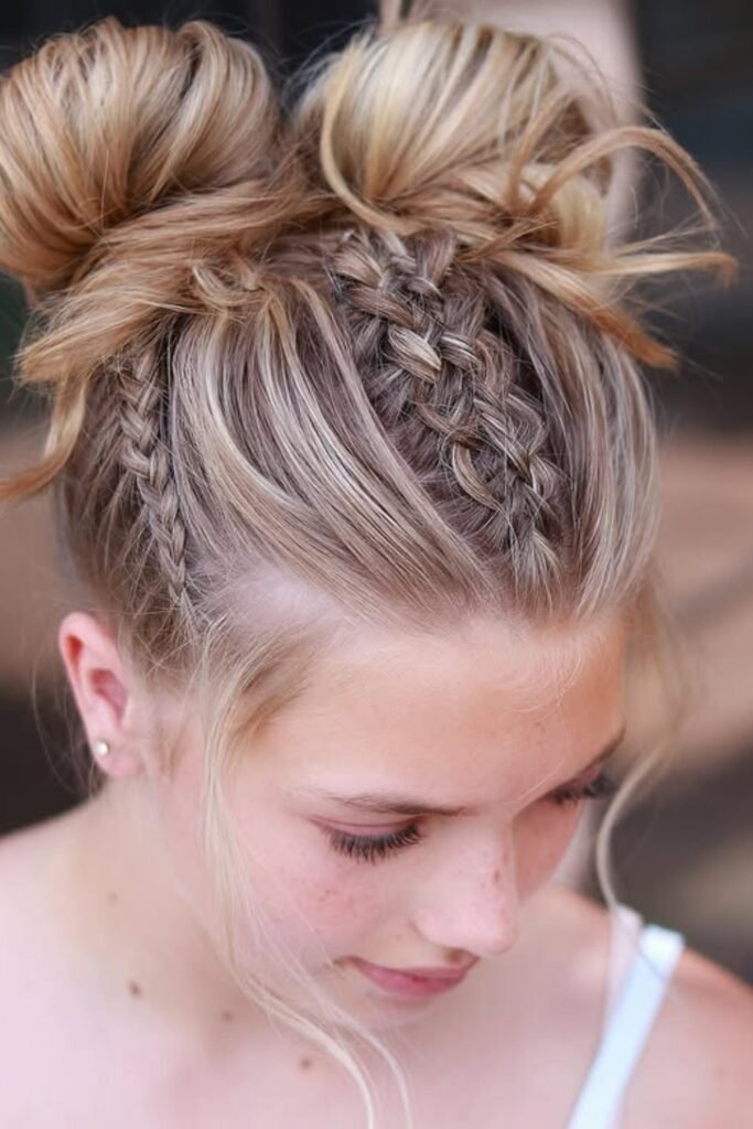 This style mixes structure with softness. The hair is first braided along the crown on both sides, starting near the front and moving back. The braids then flow into two buns placed high on the head. The braid adds detail and keeps the hair neat around the scalp. This look works well for long days because it holds strong and stays clean. It frames the head nicely and looks great from all angles.