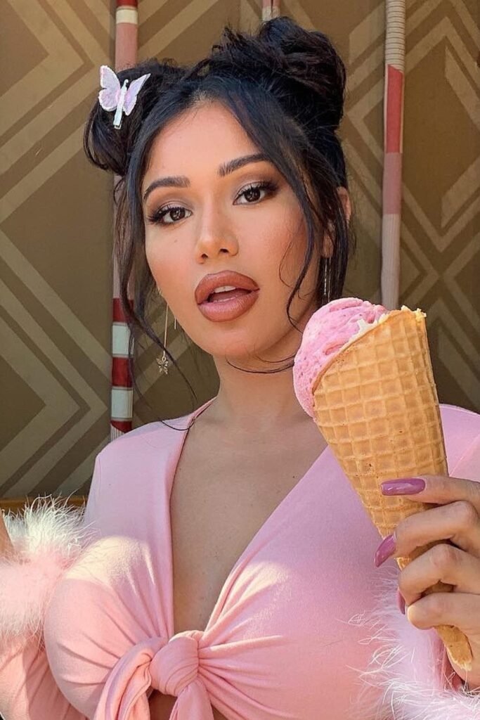 This style brings back a soft playful feel. The buns are placed high and left slightly loose. Small pieces of hair are pulled out to create texture. A butterfly clip is added to one or both buns for detail. This look feels fun and relaxed, perfect for casual days or social outings. The clip adds personality without making the style heavy.