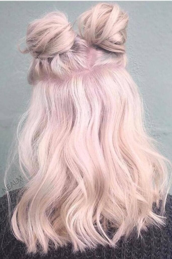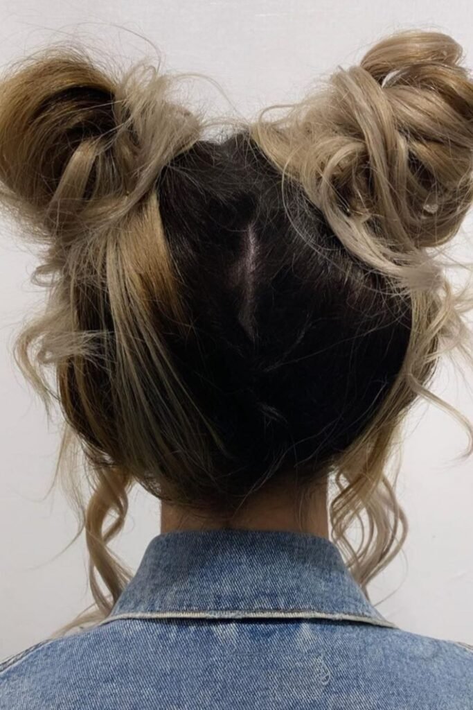 This look is relaxed and modern. The top half of the hair is pulled into two buns, but the buns are left messy with loose strands. The bottom hair stays natural. This style suits wavy or textured hair best. It gives volume on top while keeping movement below.