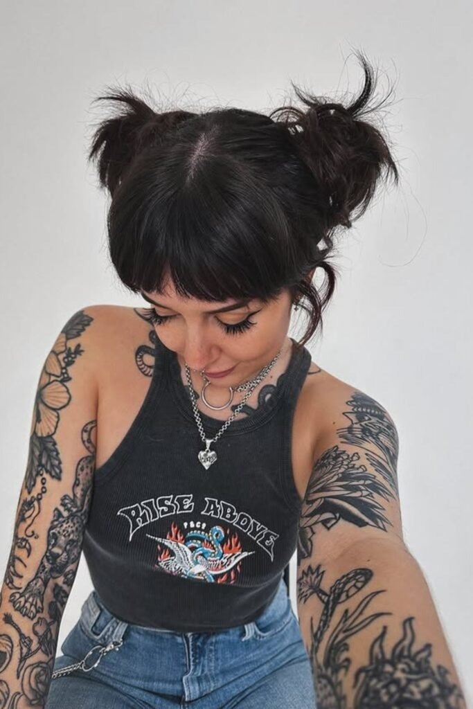 This look has attitude. The buns are messy and textured, with bangs left loose in the front. It works well with layered hair and gives a bold feel. This style is popular for creative spaces and casual events.