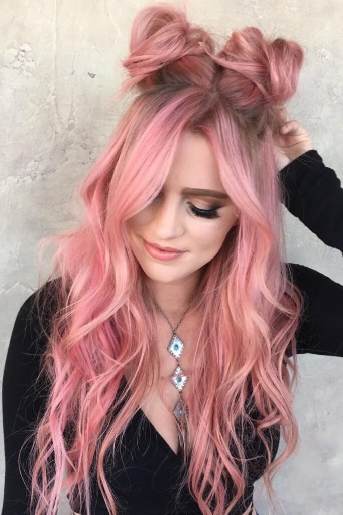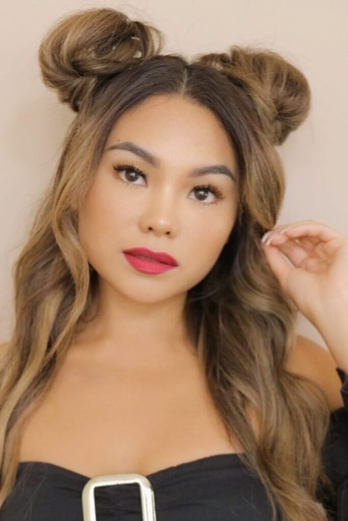 Half-up mini space buns are perfect if you like your hair down but want something fun on top. Only the top half of the hair is used to form two small buns. The rest of the hair flows freely. This style adds lift to the crown and keeps hair away from the face. It works well for medium to long hair and feels light and modern.