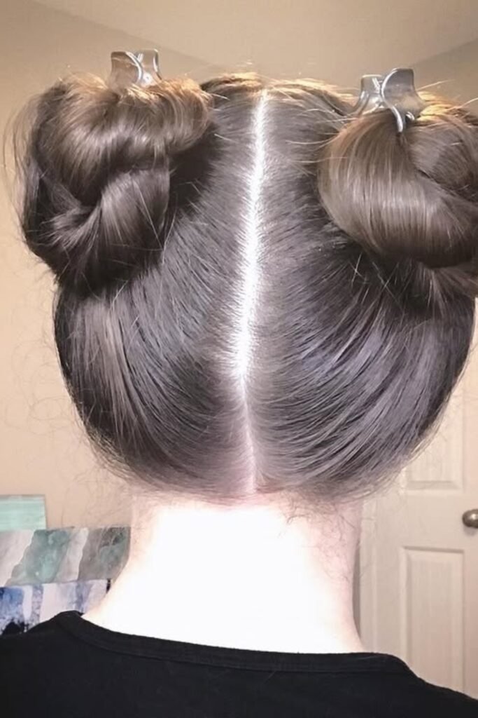 Tie each side into a ponytail where you want the buns to sit. High buns feel playful and bold. Low buns feel soft and calm. Twist each ponytail around itself to form a bun, then wrap it around the base. Secure it with hair pins, not just one but several, placed in different directions. This locks the bun in place.