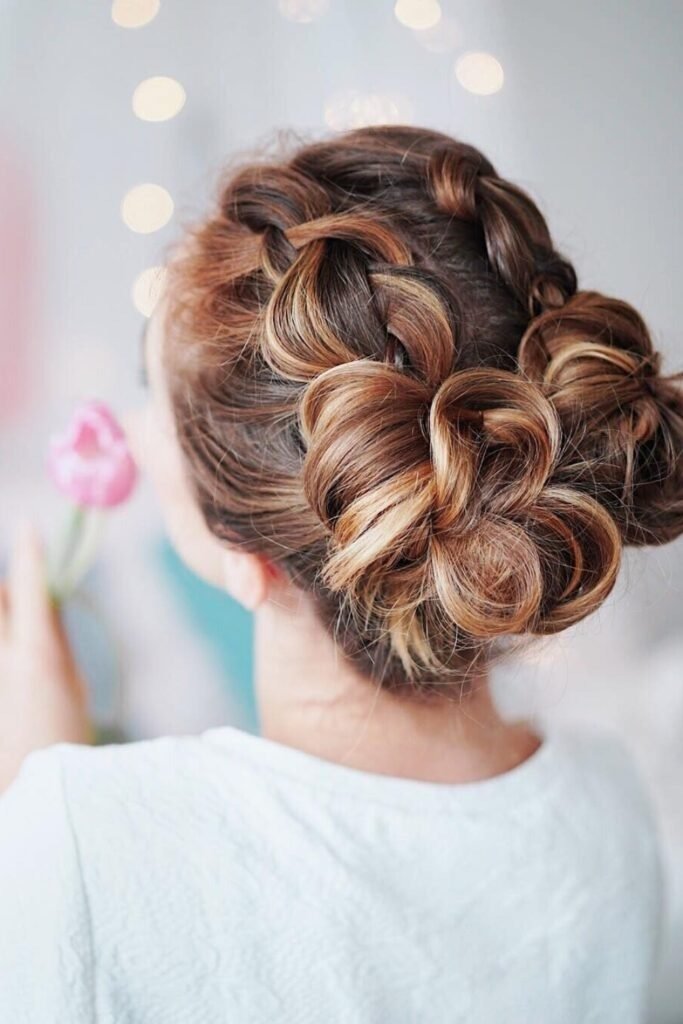 This style adds a soft creative touch. The hair is braided into two braids, and a thin ribbon is woven through each braid. The braids are then wrapped into buns. The ribbon adds color and charm without overpowering the look. This style is popular for events, photos, and festive days.