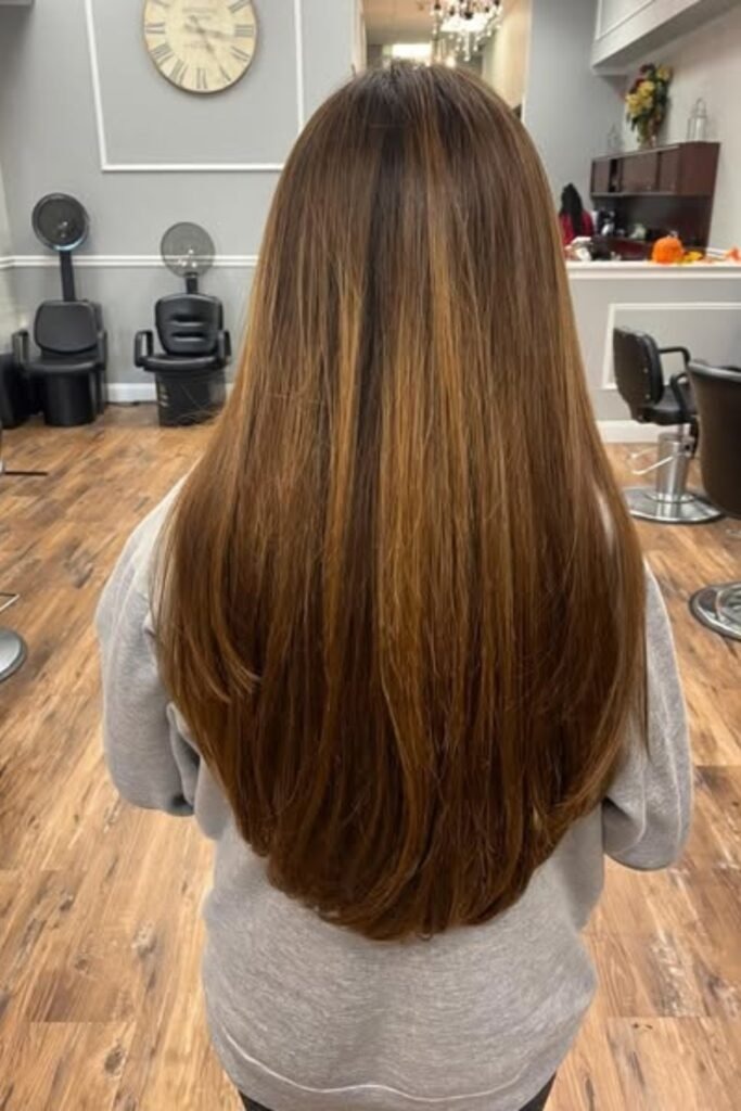 The golden straight U shape focuses on straight hair with warm tones. The cut enhances the color by keeping the ends even.