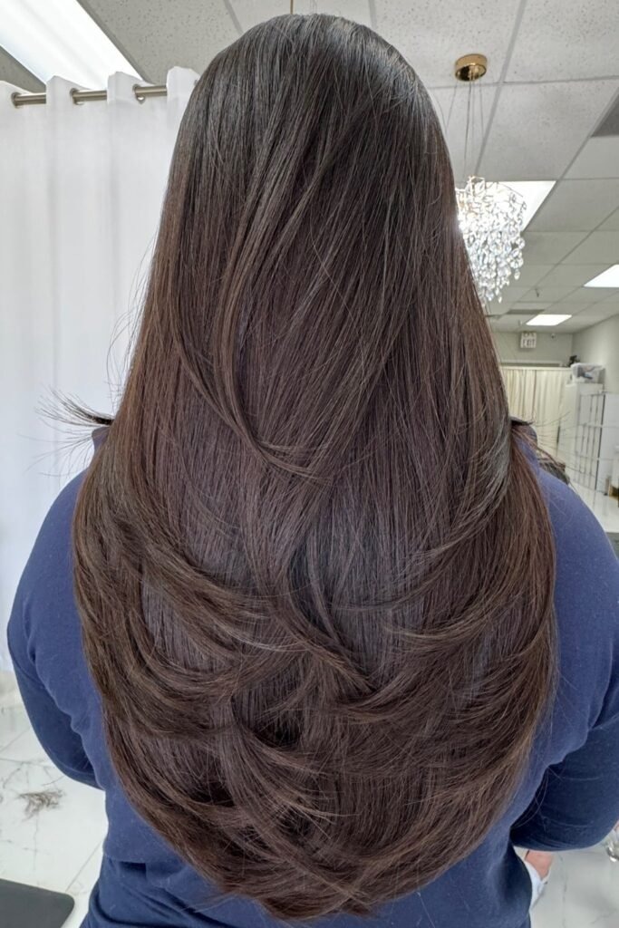 The volumized layered U cut adds layers while keeping the classic U curve. The layers are placed carefully to lift the hair without making it thin.